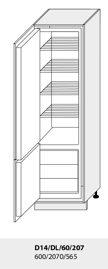 Tato skříňka je určena pro vestavnou lednici. Korpus je vyroben z kvalitního lamina v tl.18 mm v dezénu dle výběru, odolné proti oděru a škrábancům. Dvířka mají zaoblené hrany a jsou vyhotoveny z MDF desky + PVC fólie ve vysokém lesku. Kovové úchyty typu Relling. Dolní skříňky kuchyně PLATINIUM jsou dodávány bez pracovní desky, včetně soklu a bez spotřebičů. Zboží dodáváme v demontu.