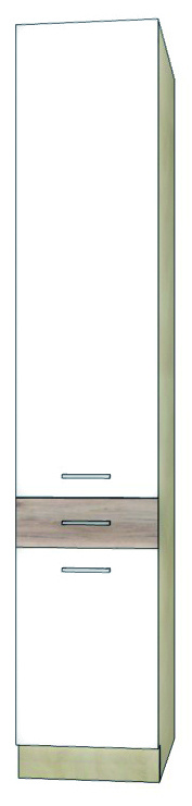 Vysoká dvoudvéřová skříňka se šuplíkem je vyrobena z laminované dřevotřísky v barevném provedení: korpus dub sonoma, dvířka san remo/bílá PVC. Dovírání v zásuvkách i dveřích je s funkcí tichého dovírání. Skříňka je bez soklu. Zboží dodáváme v demontu.