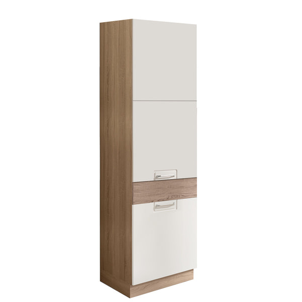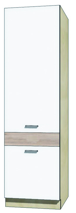 Skříňka na vestavbu lednice dvoudvéřová je vyrobena z laminované dřevotřísky v barevném provedení: korpus dub sonoma, dvířka san remo/bílá PVC. Dovírání v zásuvkách i dveřích je s funkcí tichého dovírání. Skříňka je bez soklu. Zboží dodáváme v demontu.