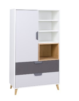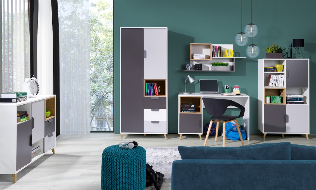 Moderní skříňka JOKER 5 je vyrobena z kvalitního lamina DTD o síle 16 mm, hrany jsou začištěny ABS hranou, pojezdy jsou kovové. skříňka má matnou povrchovou úpravu v barevném provedení bílá/šedá/dub lefkas. Sektorový nábytek JOKER tvoří 15 prvků, které můžete libovolně kombinovat. Díky čemu si můžete sestavit pokoj podle svých představ. Zboží dodáváme v demontu.