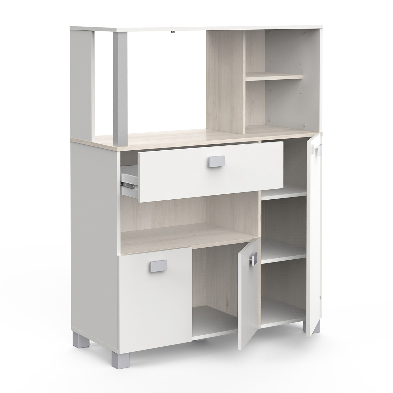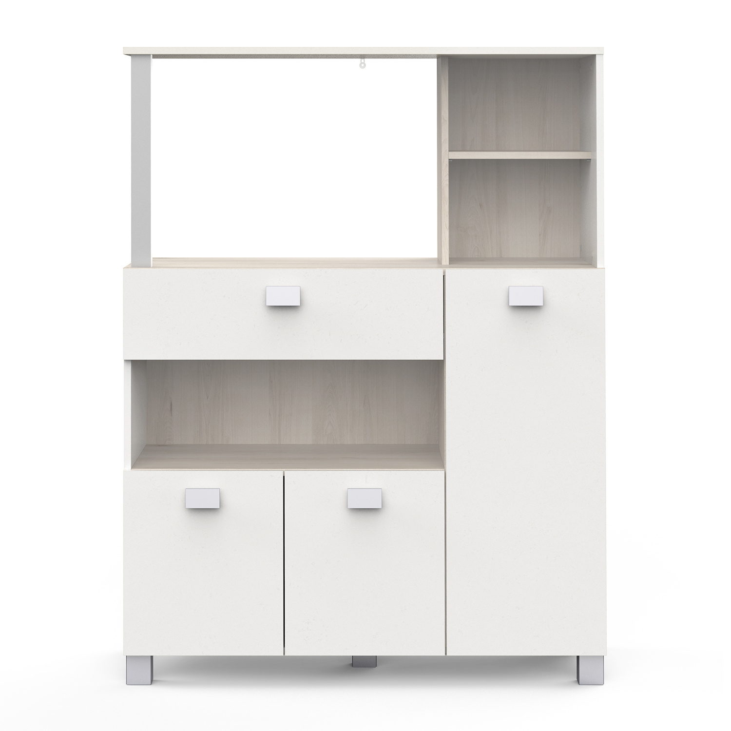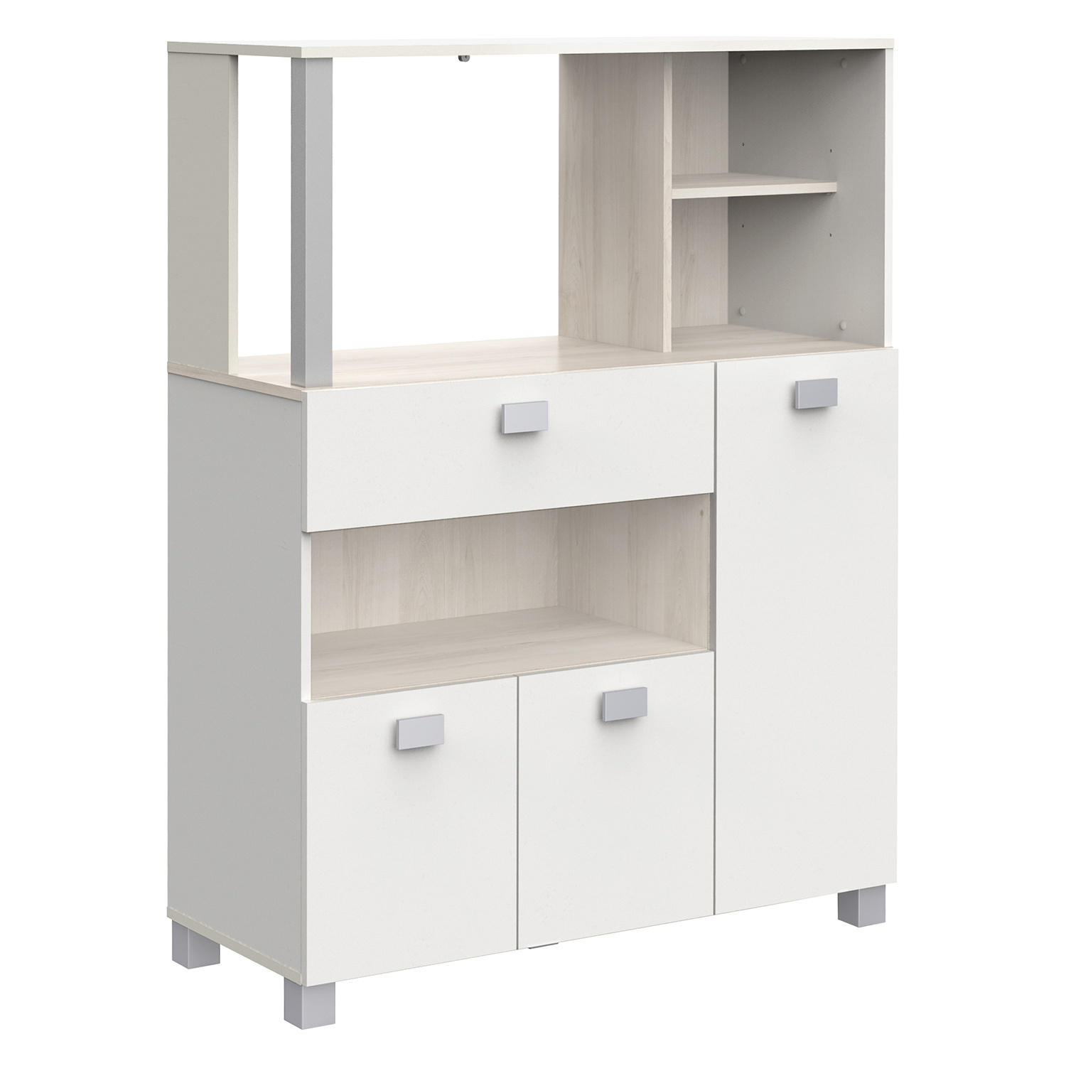 Skříňka z lamina v barevném provedení akácie/bílá. Skříňka s 1 velkou zásuvkou s kovovými pojezdy, 3 dvířky. Prostor nejen na mikrovlnnou troubu s nosností max. 15 kg a rozměrem (š/h/v) 60×39×44 cm. Zboží dodáváme v demontu.