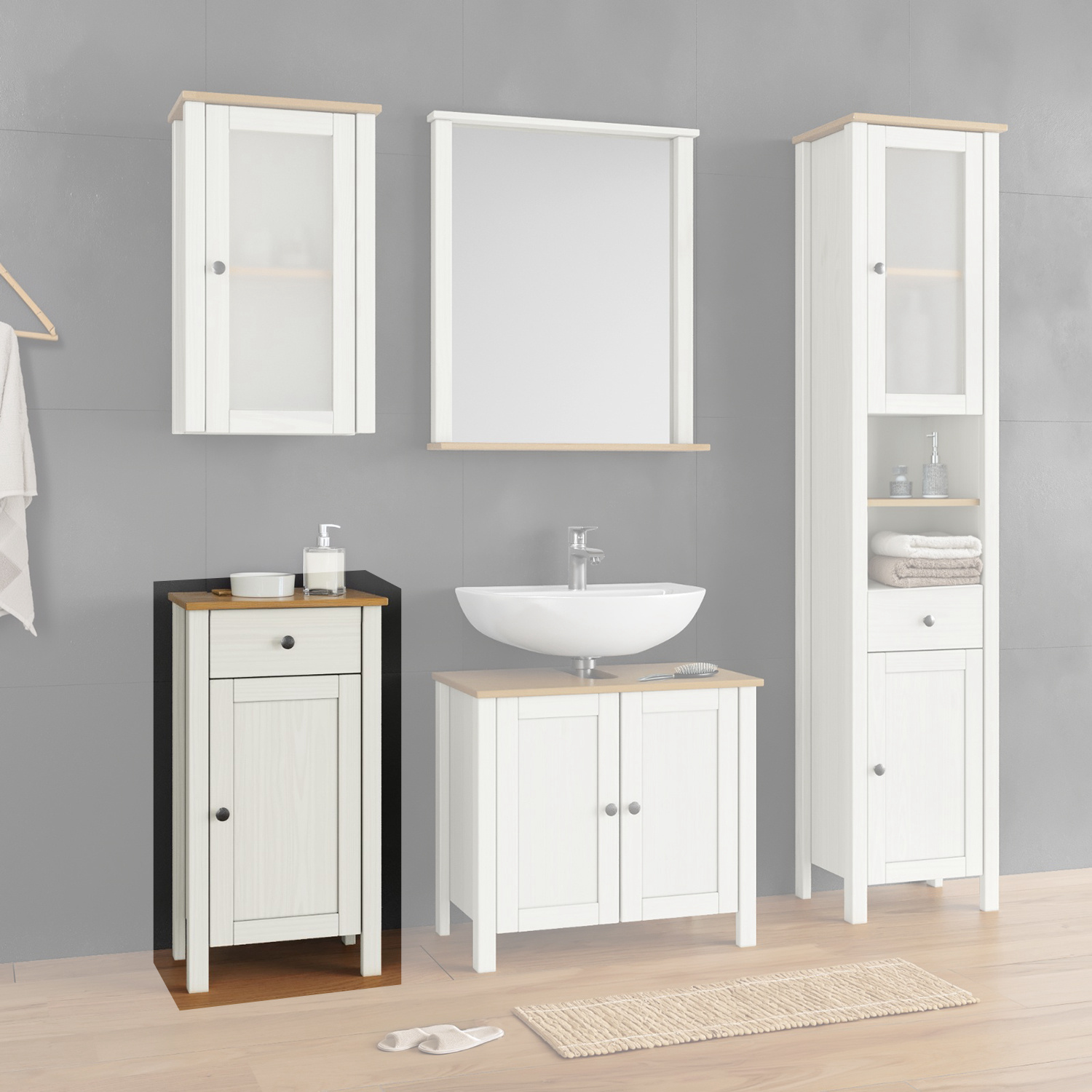 materiál masiv borovice, barevné provedení bílá / buk 1 dvířka, za nimi 1 police, 1 zásuvka s kovovými pojezdy maximální nosnosti uvedeny v návodu k montáži součást sestavy PORTO bílá/buk