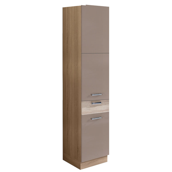 Vysoká dvoudvéřová skříňka se šuplíkem je vyrobena z laminované dřevotřísky v barevném provedení dub sonoma/cappuccino lesk. Skříně s tichým dovíráním v zásuvkách a dvířkách. Výhodou systému Premio je možnost libovolného sestavení skříněk a díky tomu můžete tvořit vybrané kompozice a přizpůsobit je vlastním interiérům. Skříňka je bez soklu. Zboží dodáváme v demontu.