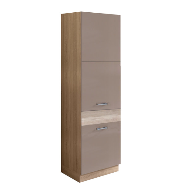 Skříňka na vestavbu lednice dvoudvéřová je vyrobena z laminované dřevotřísky v barevném provedení dub sonoma/cappuccino lesk. Skříně s tichým dovíráním v zásuvkách a dvířkách. Výhodou systému Premio je možnost libovolného sestavení skříněk a díky tomu můžete tvořit vybrané kompozice a přizpůsobit je vlastním interiérům. Skříňka je bez soklu. Zboží dodáváme v demontu.