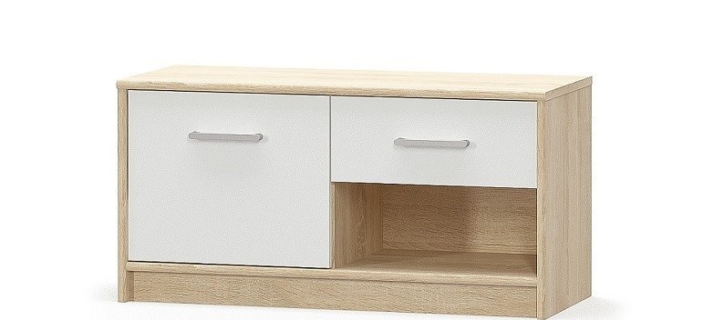 Předsíňová skříňka Tips je vyrobena z lamina o síle 16mm. Skříňku s plnými dvířky, zásuvkou a otevřenou poličkou nabízíme v dezénu bílá/dub sonoma. Hrany lamina chrání ABS o síle 0,5mm. Pojezdy zásuvky jsou kovové, úchytky plastové. Kombinujte dle potřeby i s dalšími prvky z kolekce Tips. Zboží dodáváme v demontu.