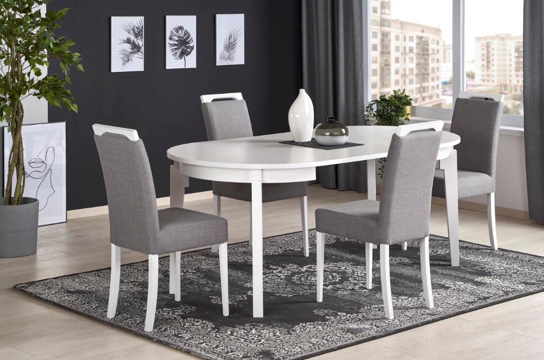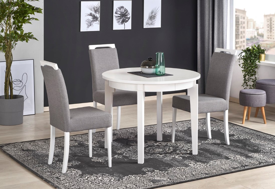 Tento kulatý jídelní stůl lze rozložit do oválného tvaru. Deska stolu je v kombinaci MDF a přírodní dýhy dub. Nohy jsou vyrobeny z bukového masivu. Stůl má bílou barvu desky i nohou. Židle nejsou součástí produktu. Zboží je dodáváno v demontu.