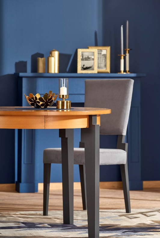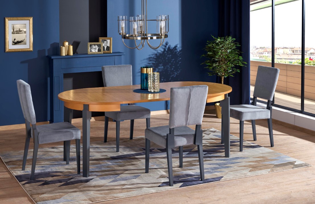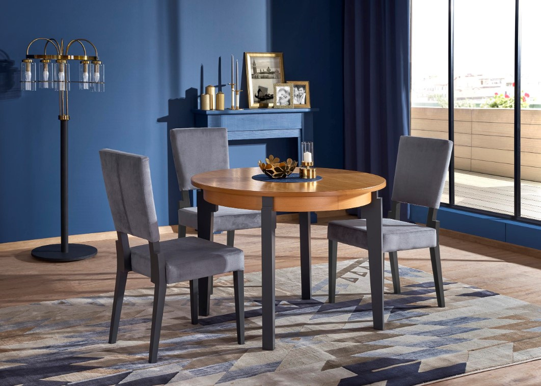 Tento kulatý jídelní stůl lze rozložit do oválného tvaru. Deska stolu je v kombinaci MDF a přírodní dýhy dub. Nohy jsou vyrobeny z bukového masivu. Deska má barvu dub medový, nohy jsou v barvě grafit. Židle nejsou součástí produktu. Zboží je dodáváno v demontu.