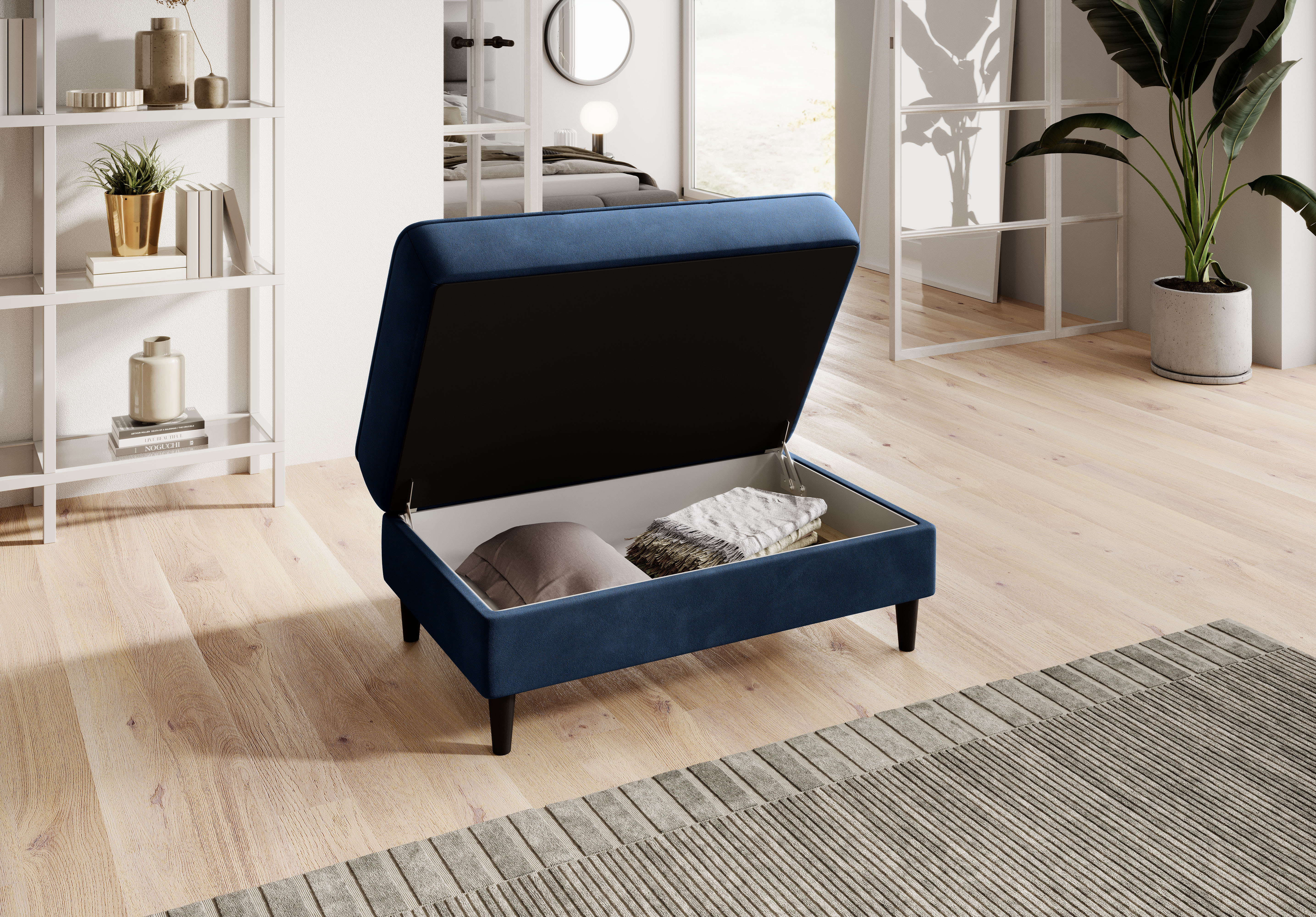 Taburet Bellis v dezénu Loco 40 s výplní sedáku tvořenou HR pěnou a taštičkovými pružinami. Potahová látka Loco: látka příjemná na dotek, připomíná samet, nevybledne, stínový vzhled, mírný lesk. Taburet má úložný prostor o rozměru: š.87 x hl.53 x v.13 cm. Nosnost taburetu 80 kg. Dřevěné nohy v černé barvě jsou vysoké 11 cm. K taburetu možno zakoupit pohovku Bellis.