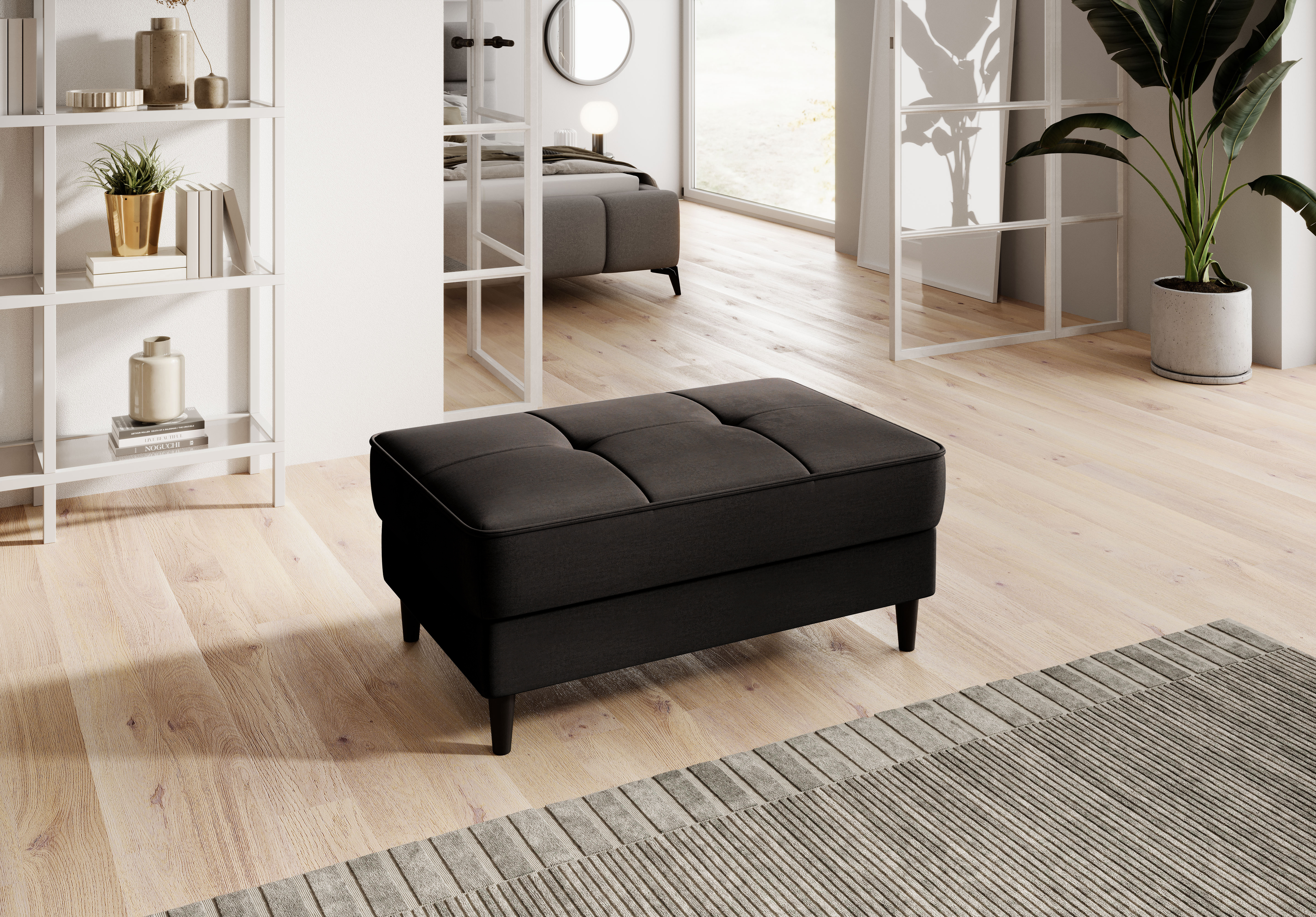 Taburet Bellis v dezénu Nube 22 s výplní sedáku tvořenou HR pěnou a taštičkovými pružinami. Potahová látka Nube: odolná a pevná, hladký povrch s odleskem, voděodolná. Ozdobné vyšívání sedáku. Taburet má úložný prostor o rozměru: š.87 x hl.53 x v.13 cm. Nosnost taburetu 80 kg. Dřevěné nohy v černé barvě jsou vysoké 11 cm. K taburetu možno zakoupit pohovku Bellis.
