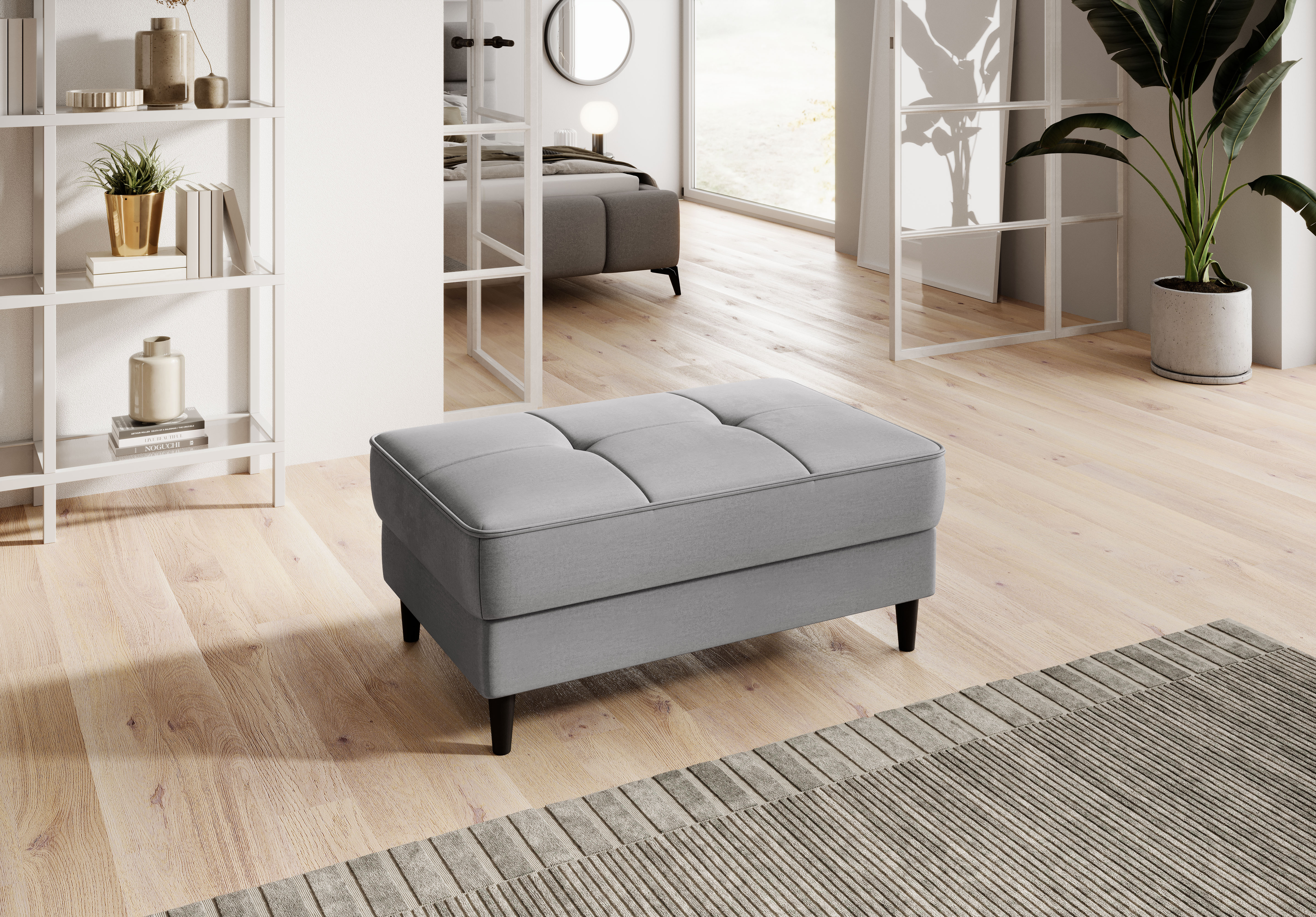 Taburet Bellis v dezénu Nube 3 s výplní sedáku tvořenou HR pěnou a taštičkovými pružinami. Potahová látka Nube: odolná a pevná, hladký povrch s odleskem, voděodolná. Ozdobné vyšívání sedáku. Taburet má úložný prostor o rozměru: š.87 x hl.53 x v.13 cm. Nosnost taburetu 80 kg. Dřevěné nohy v černé barvě jsou vysoké 11 cm. K taburetu možno zakoupit pohovku Bellis.