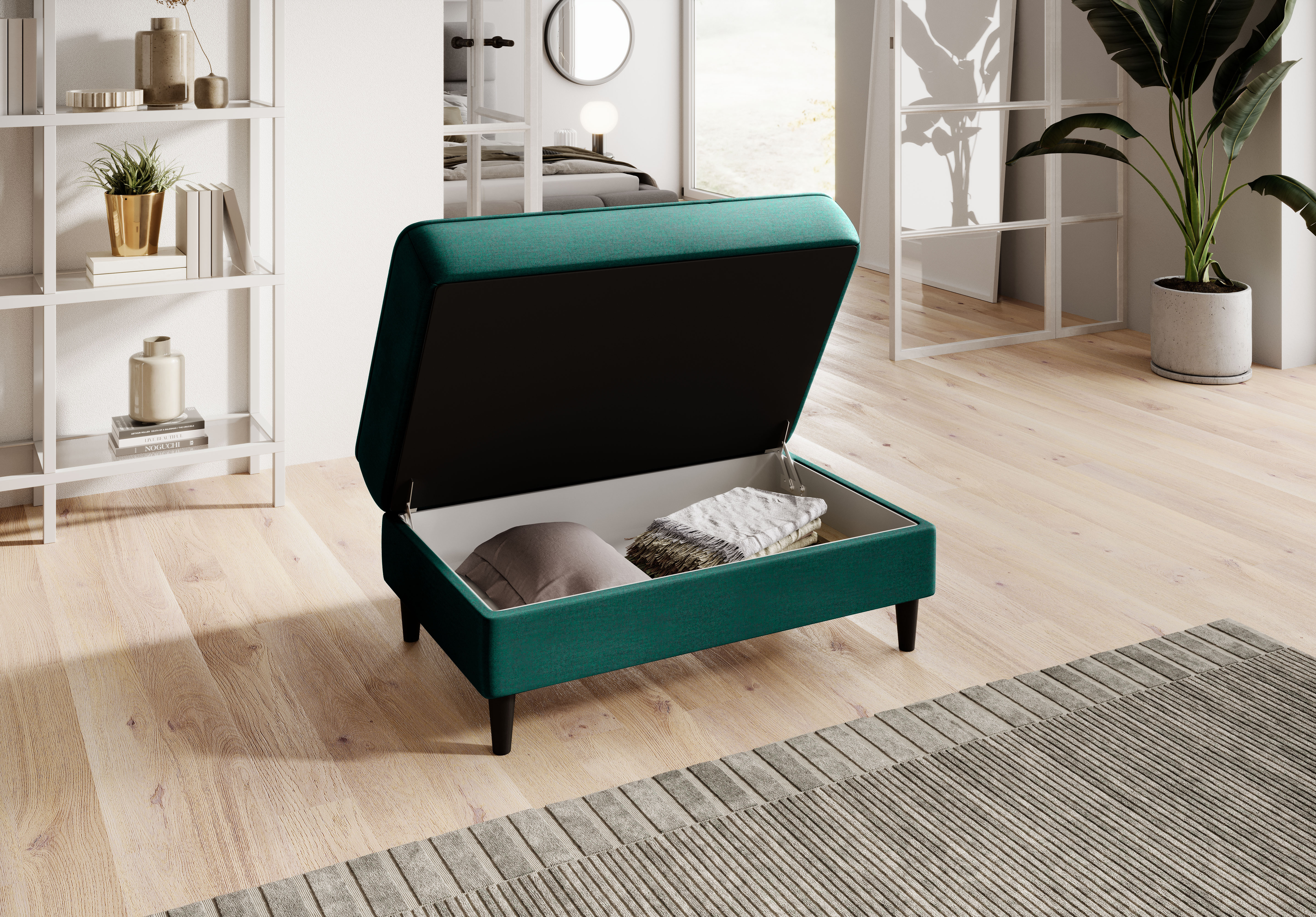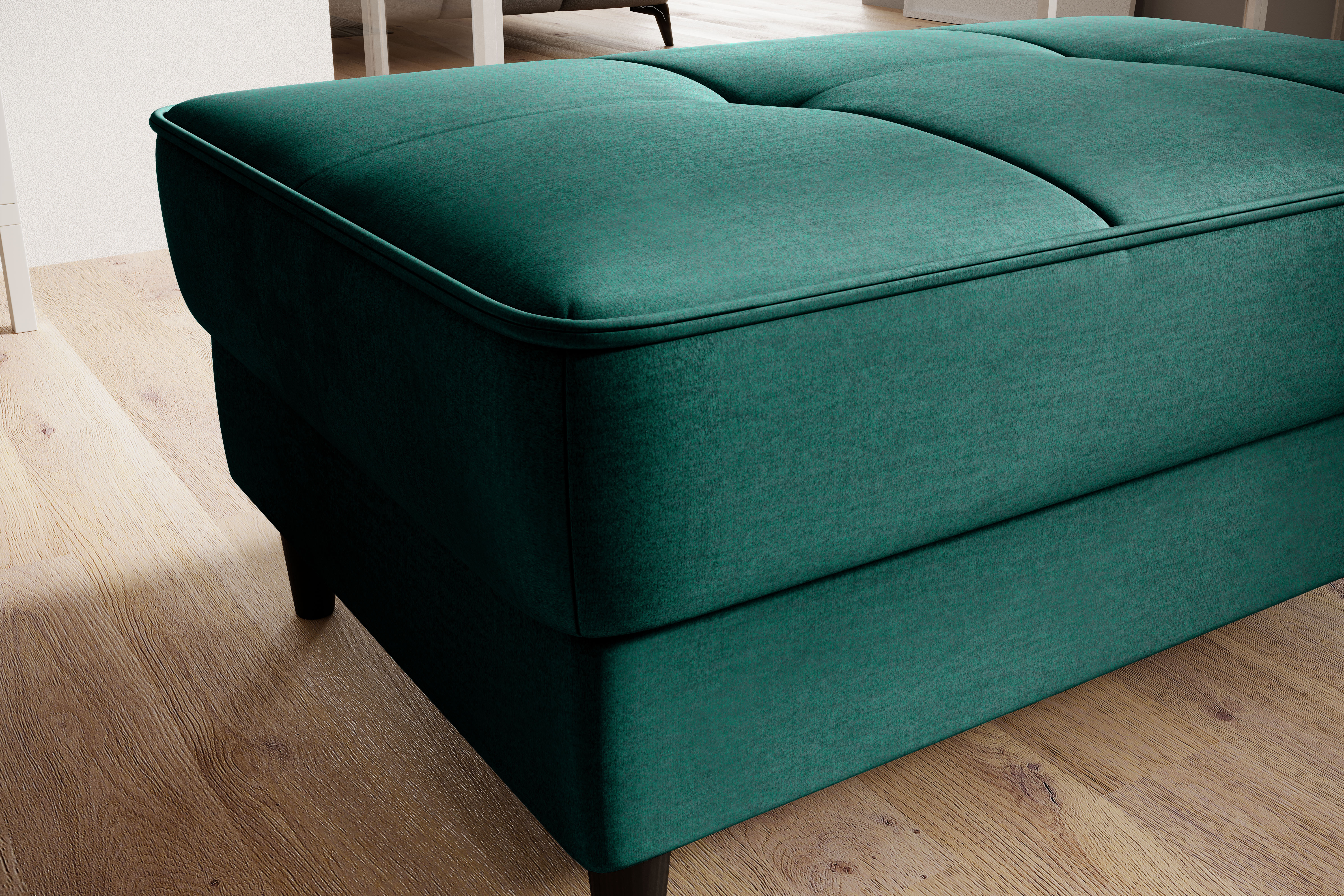 Taburet Bellis v dezénu Nube 35 s výplní sedáku tvořenou HR pěnou a taštičkovými pružinami. Potahová látka Nube: odolná a pevná, hladký povrch s odleskem, voděodolná. Ozdobné vyšívání sedáku. Taburet má úložný prostor o rozměru: š.87 x hl.53 x v.13 cm. Nosnost taburetu 80 kg. Dřevěné nohy v černé barvě jsou vysoké 11 cm. K taburetu možno zakoupit pohovku Bellis.