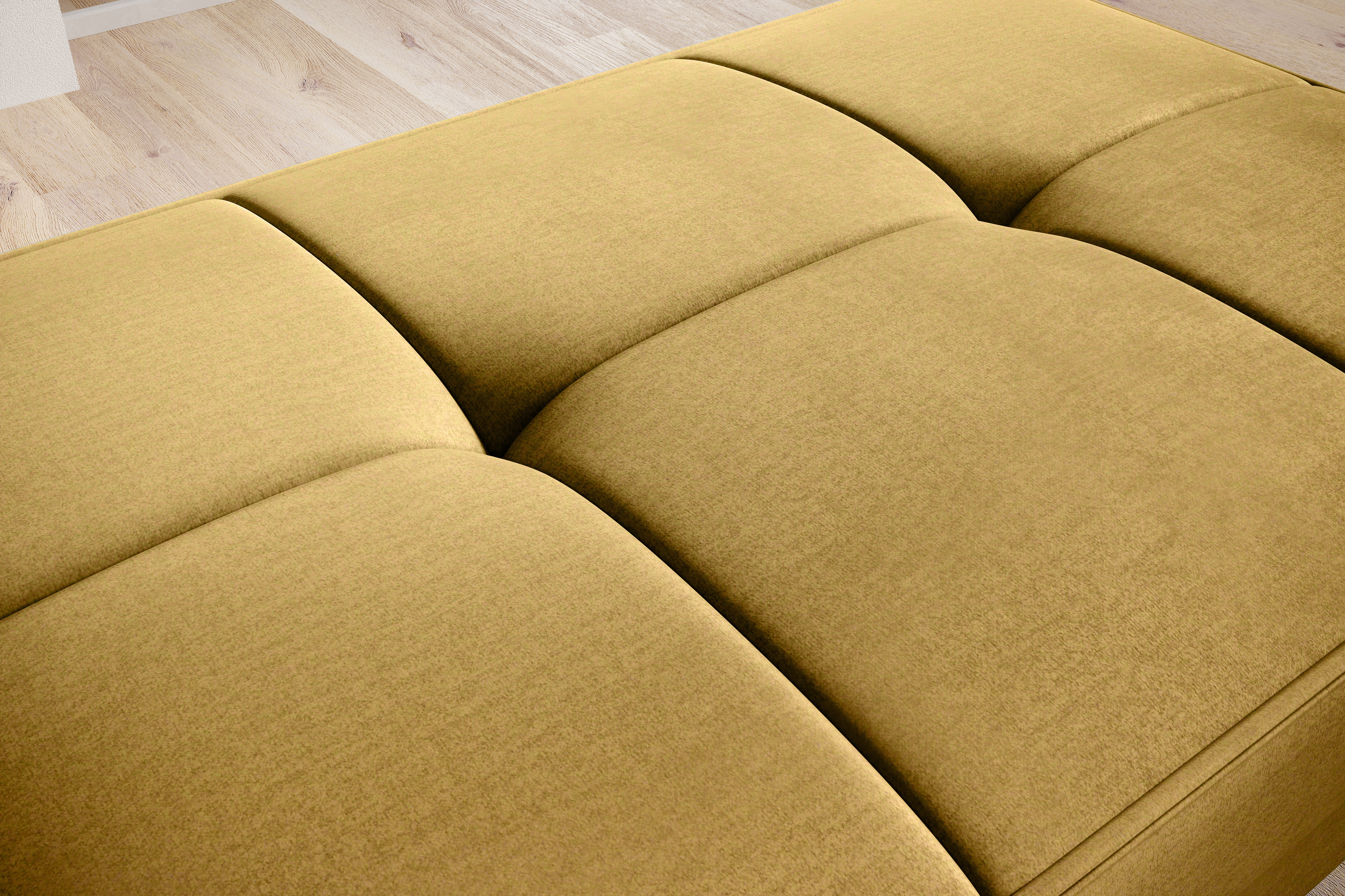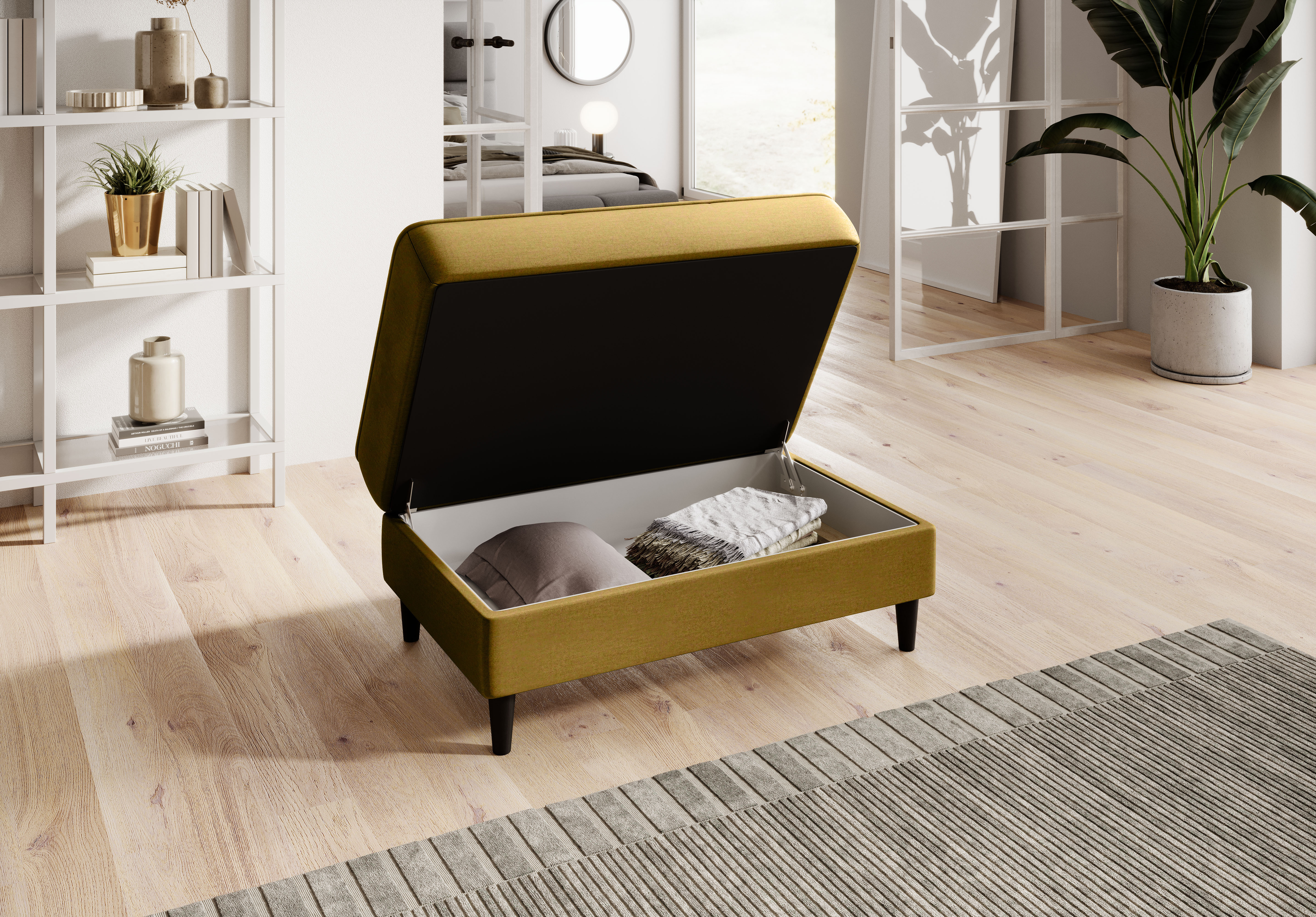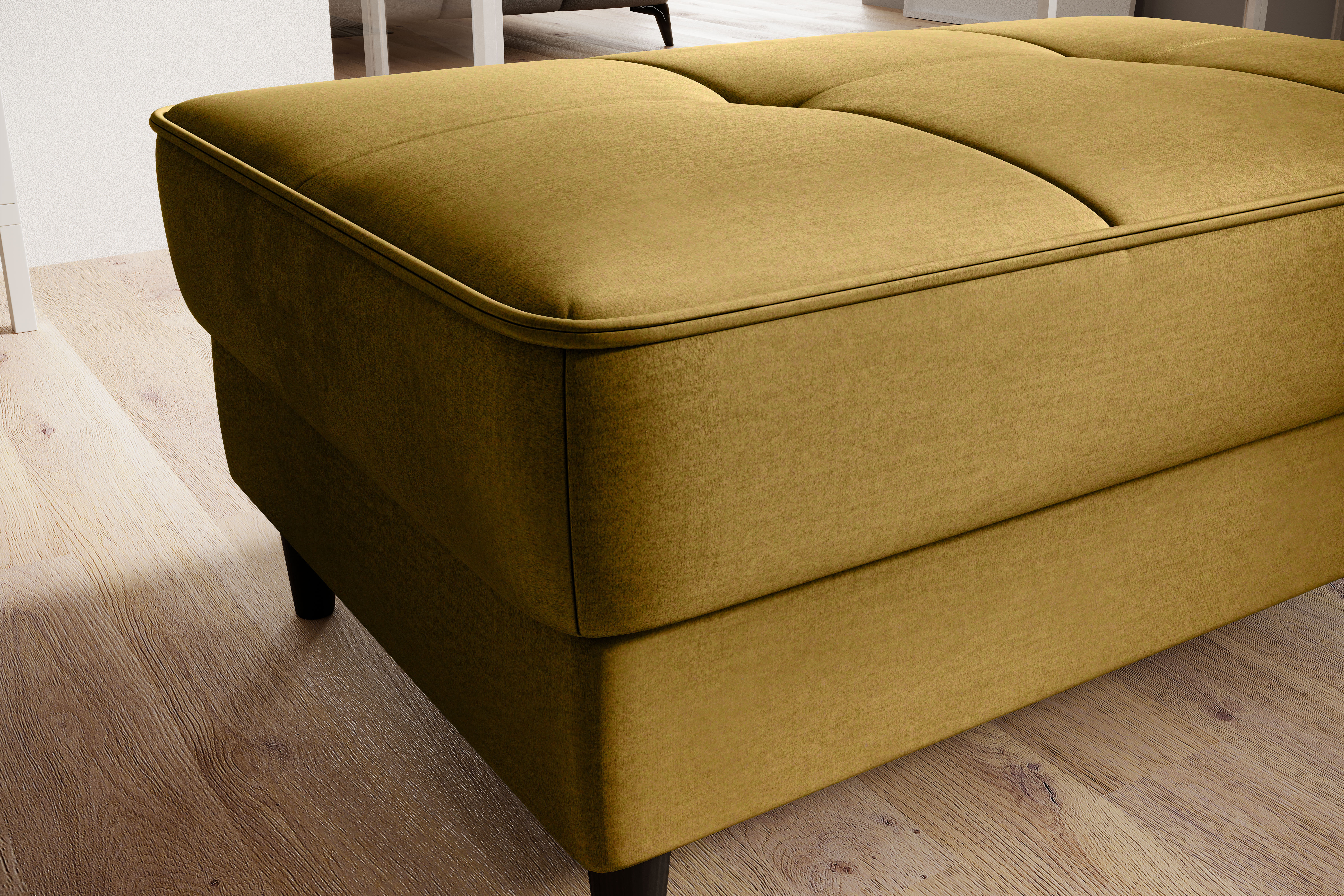 Taburet Bellis v dezénu Nube 45 s výplní sedáku tvořenou HR pěnou a taštičkovými pružinami. Potahová látka Nube: odolná a pevná, hladký povrch s odleskem, voděodolná. Ozdobné vyšívání sedáku. Taburet má úložný prostor o rozměru: š.87 x hl.53 x v.13 cm. Nosnost taburetu 80 kg. Dřevěné nohy v černé barvě jsou vysoké 11 cm. K taburetu možno zakoupit pohovku Bellis.