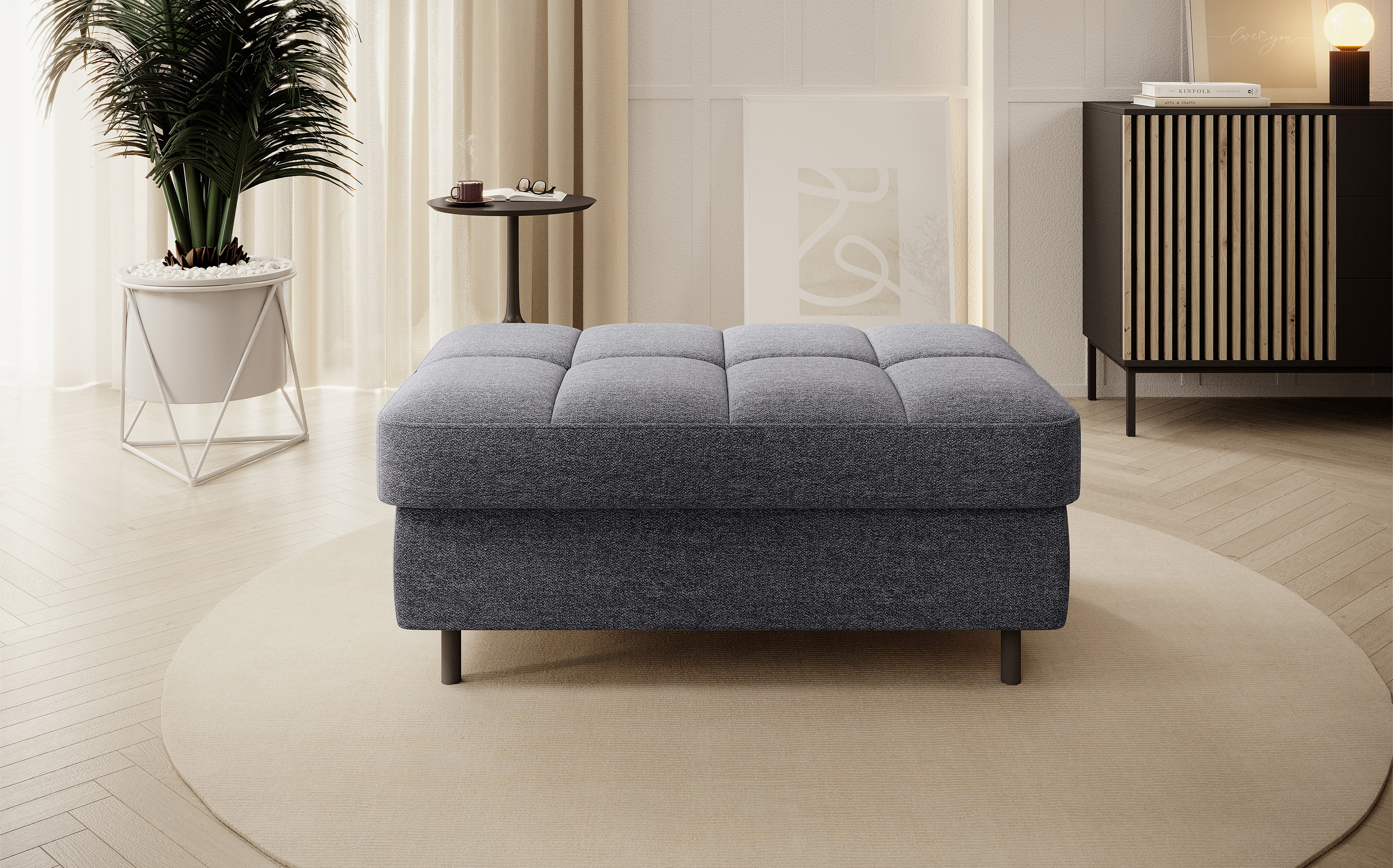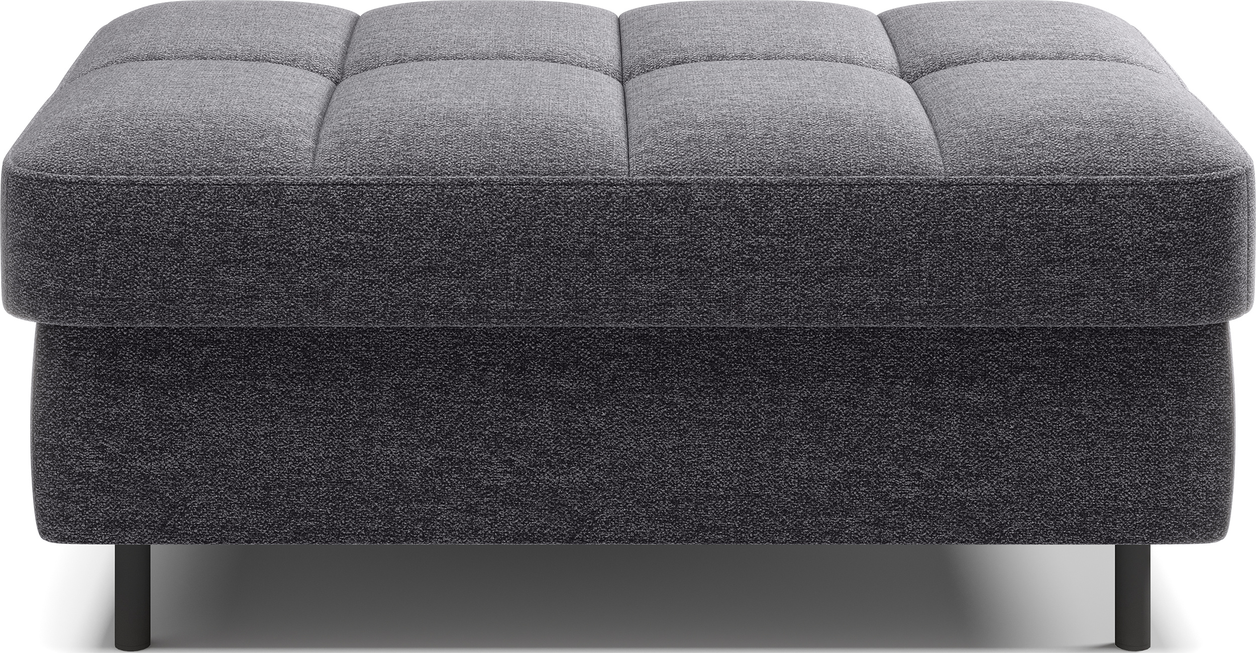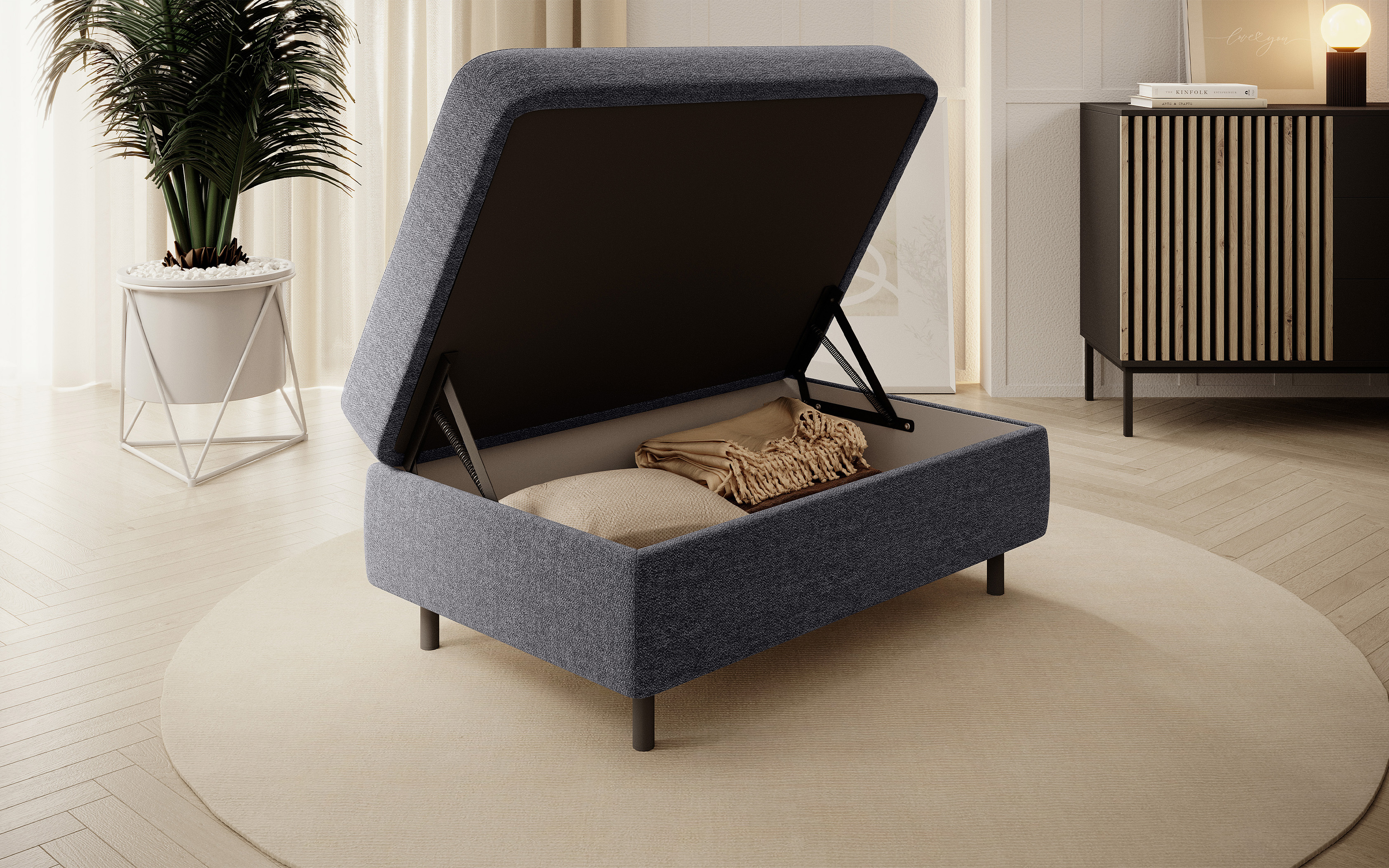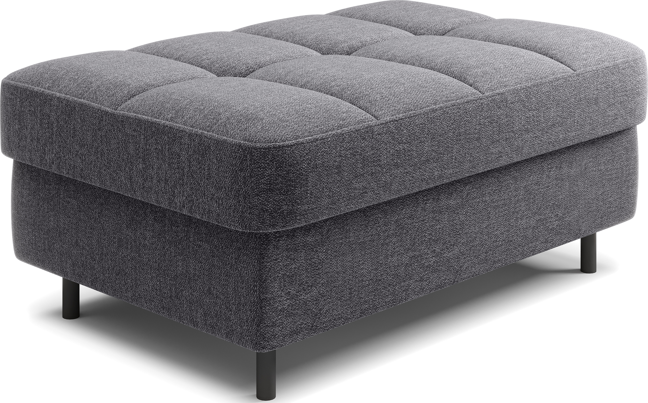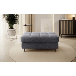 Taburet Gomsi v provedení Aspen 05. Výplň sedáku se skládá z pružiny B-wave, HR pěny a pěny T2130. Je vybavena úložným prostorem o rozměru 80x60x12 cm. Nohy jsou kovové o výšce 10 cm.