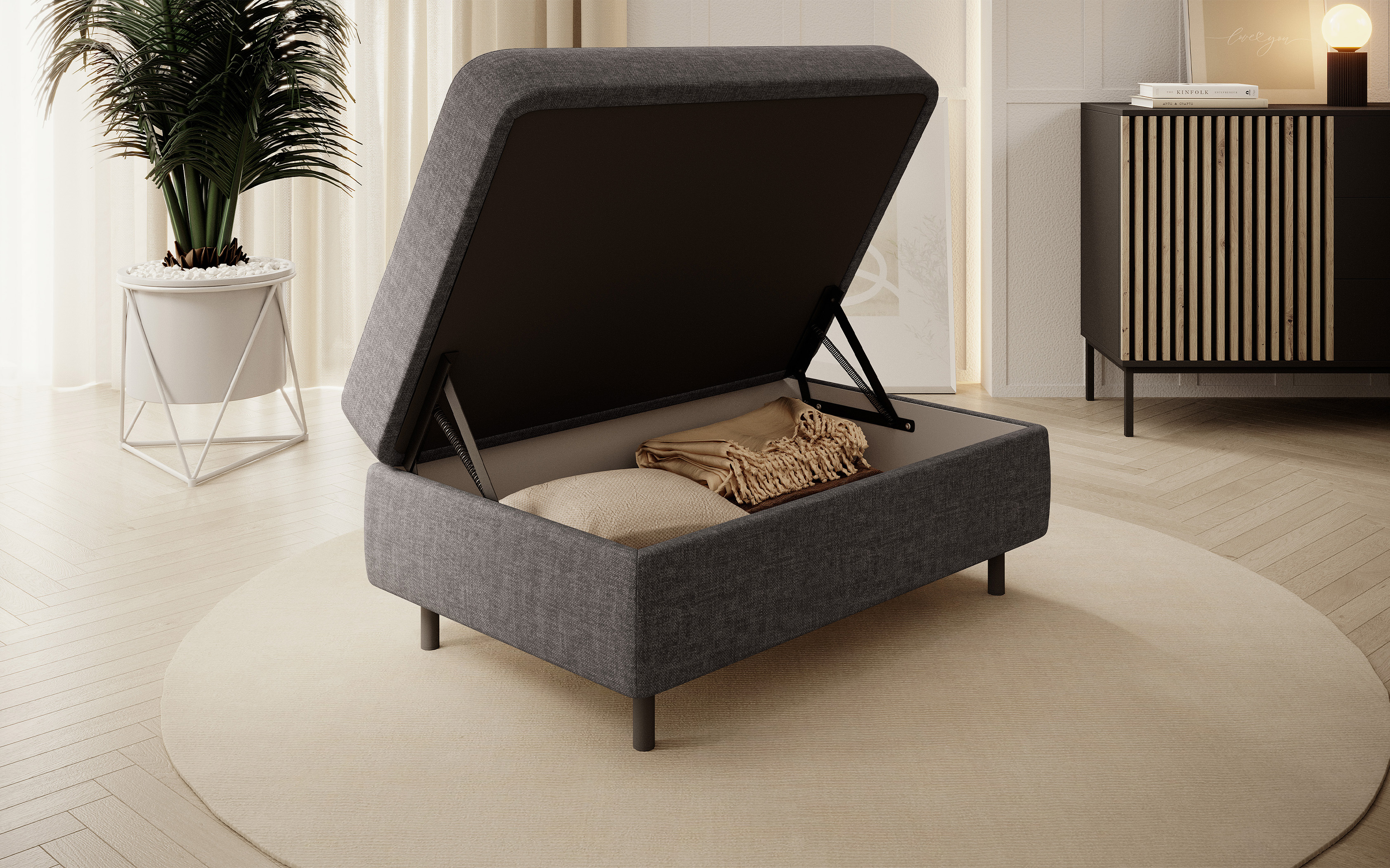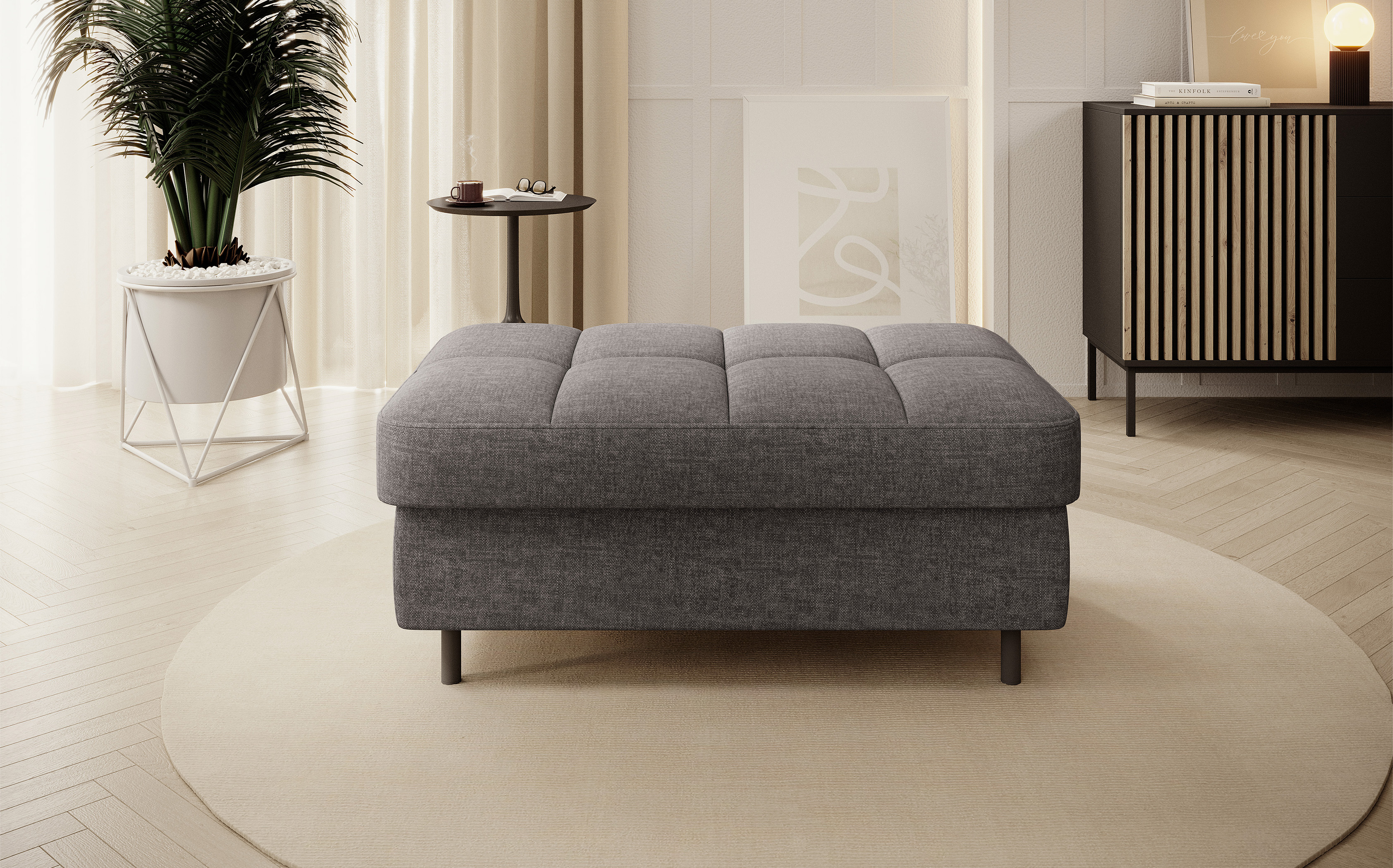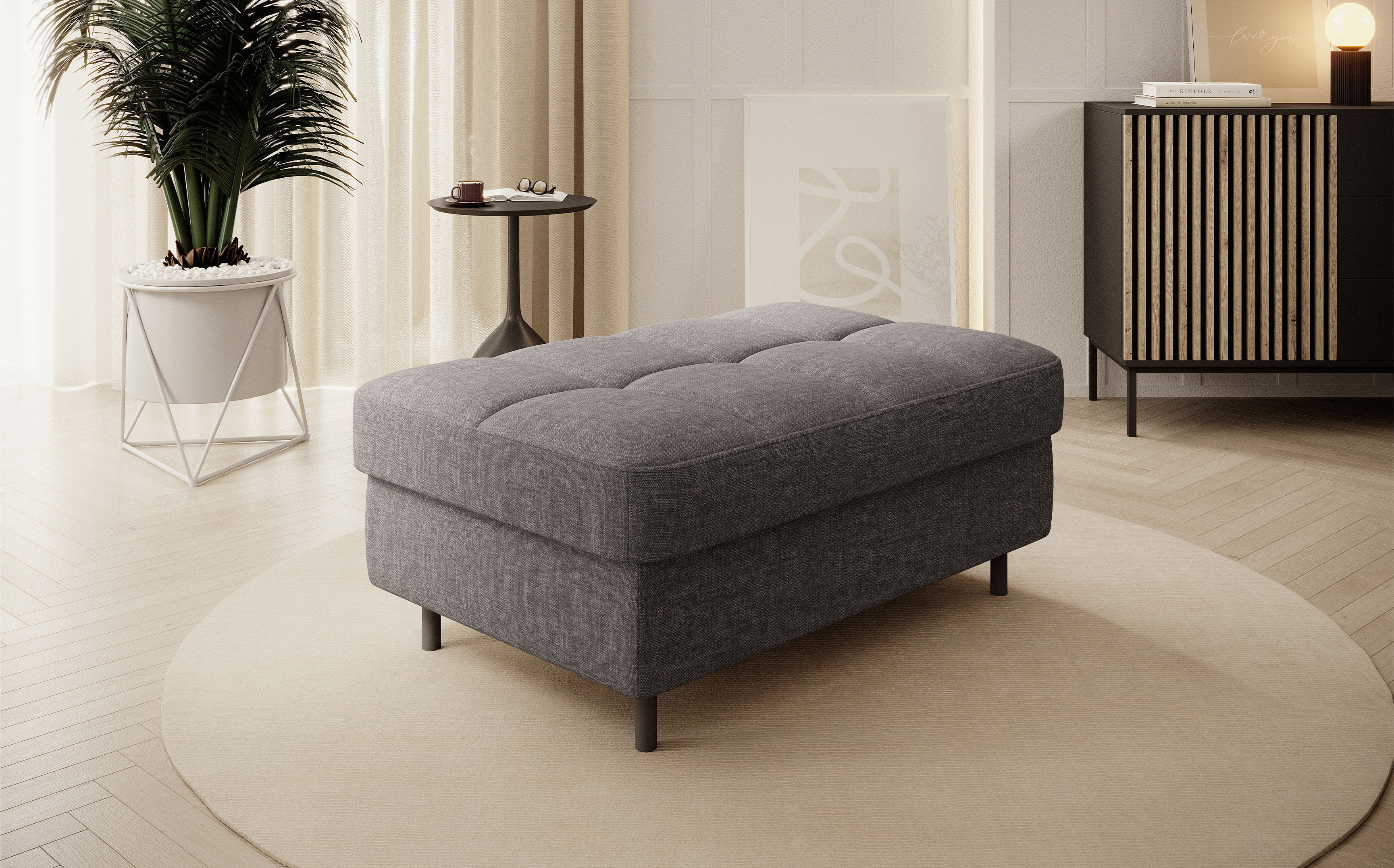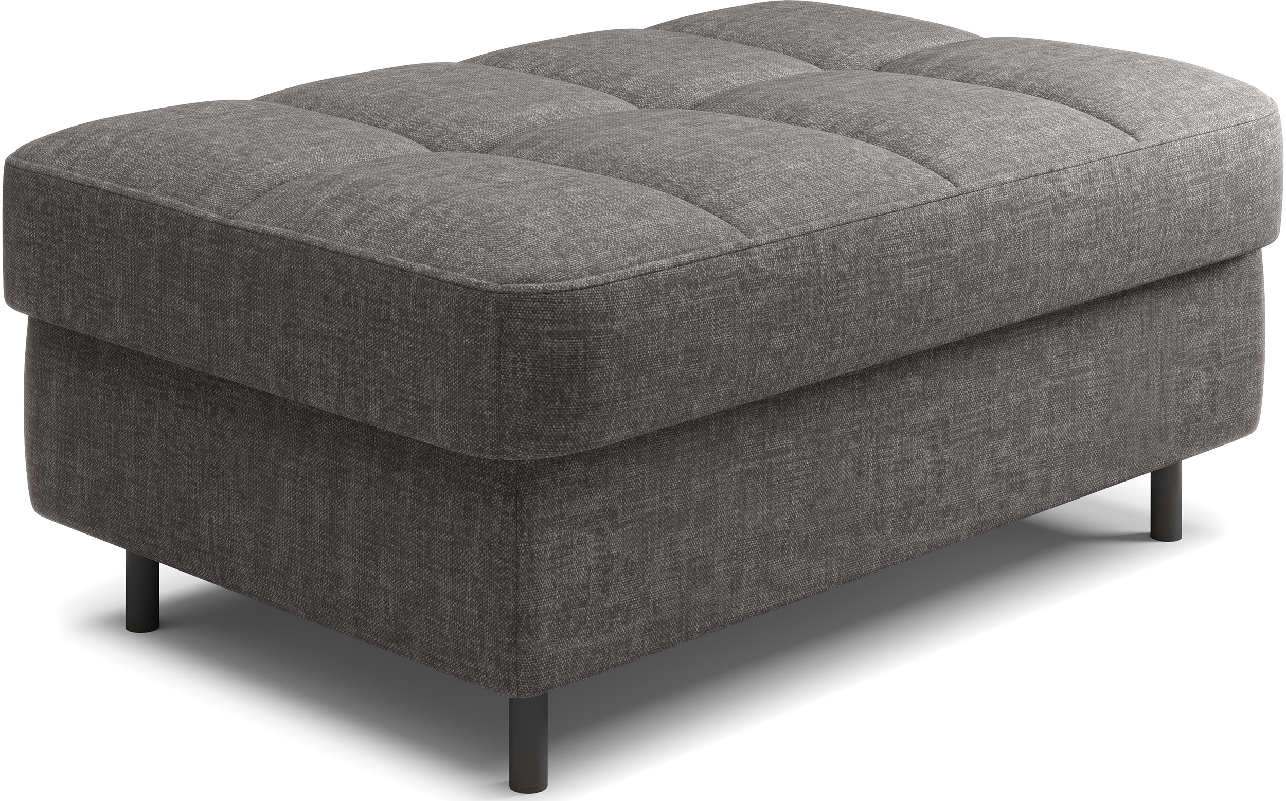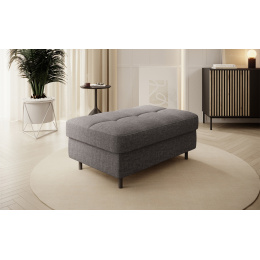Taburet Gomsi v provedení Manhattan 06. Výplň sedáku se skládá z pružiny B-wave, HR pěny a pěny T2130. Je vybavena úložným prostorem o rozměru 80x60x12 cm. Nohy jsou kovové o výšce 10 cm.