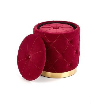Taburety Polly jsou potaženy sametovou látkou v bordó barvě. V dolní části je efektní zlatý lem z chromované oceli. Nabízí nejen funkci sezení, ale současně i možnost úložného prostoru odklopením vrchní části. Uložit zde můžete různé drobnosti, ale i menší taburet do většího. Maximální nosnost jednoho taburetu činí 100 kg. Zboží dodáváme v demontu.