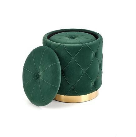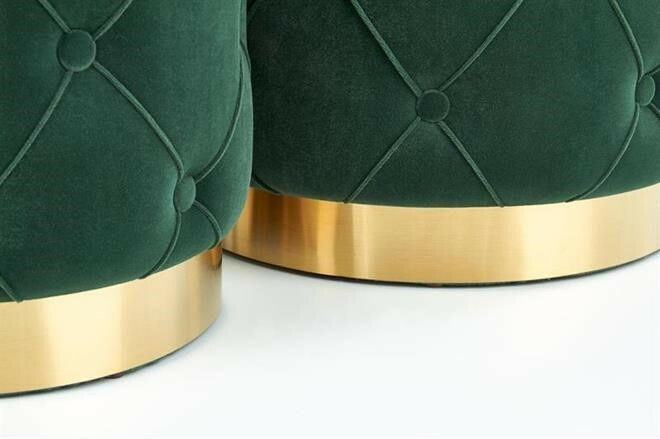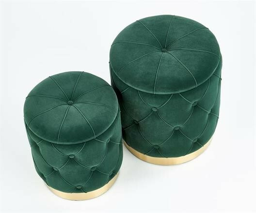 Taburety Polly jsou potaženy sametovou látkou v tmavě zelené barvě. V dolní části je efektní zlatý lem z chromované oceli. Nabízí nejen funkci sezení, ale současně i možnost úložného prostoru odklopením vrchní části. Uložit zde můžete různé drobnosti, ale i menší taburet do většího. Maximální nosnost jednoho taburetu činí 100 kg. Zboží dodáváme v demontu.