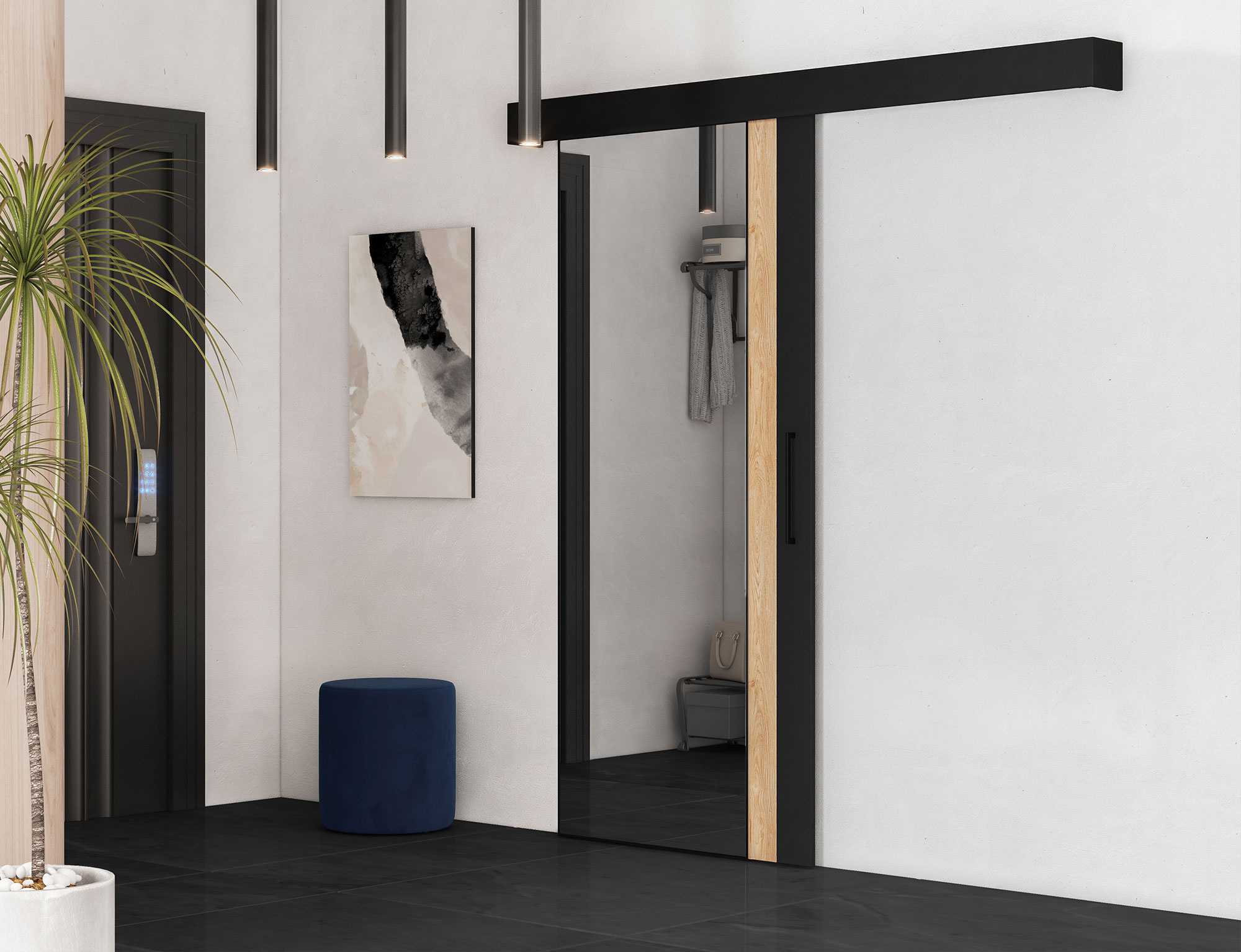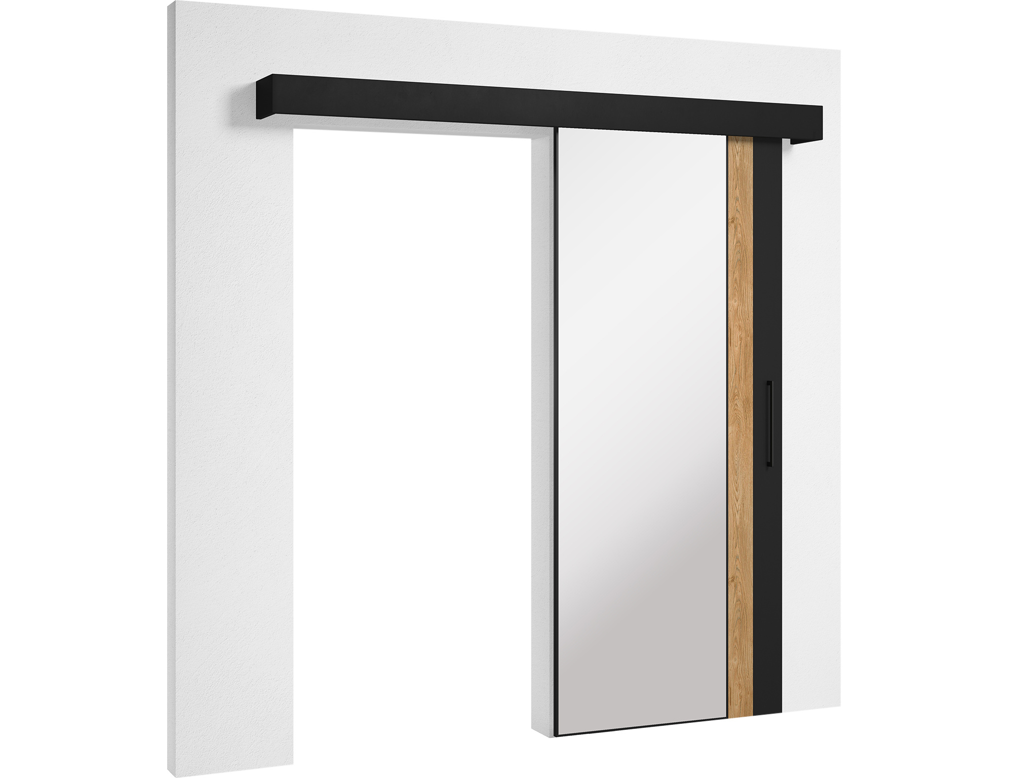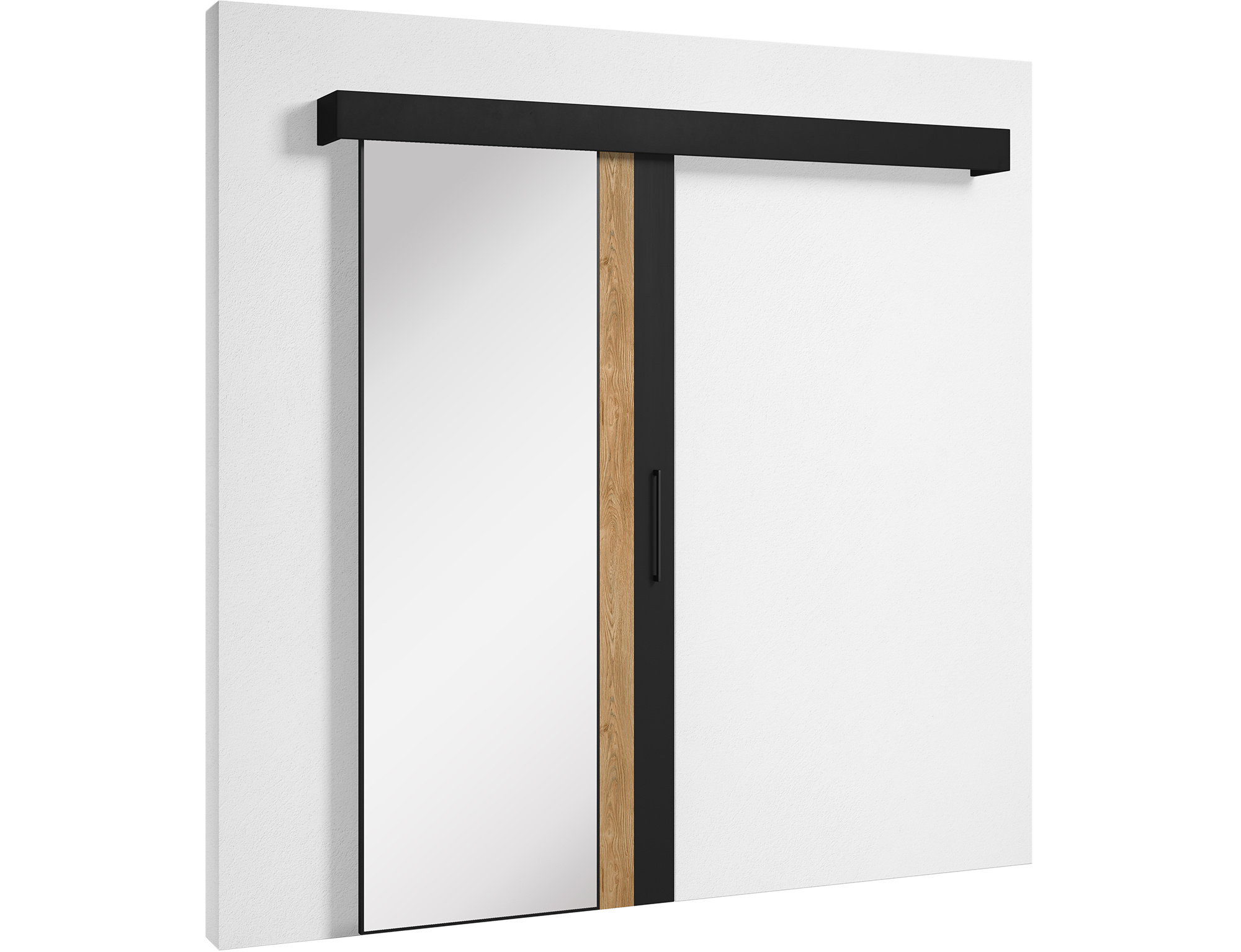 The Tilmann sliding door is a modern and elegant solution, ideal for those who appreciate stylish design in their interiors. It measures 96.5 cm x 205 cm and is made from durable materials: laminated furniture board and plastic. Its black semi-matte finish gives it a contemporary look. Equipped with a soft-close mechanism and the Laguna S100 system, it ensures smooth and quiet door movement. The set also includes a cover and a black handle that add extra elegance. The door features a stopper, a carriage, and a bottom guide for increased safety in use. Installation is simple, through wall mounting. Tilmann is the perfect choice for those seeking a stylish and functional solution for their interiors, ensuring maximum space utilization.