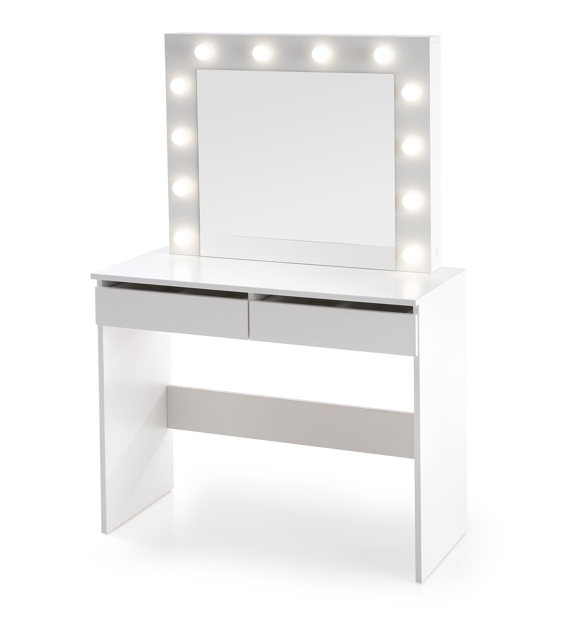 Stylový toaletní stolek HOLLYWOOD s LED osvětlením. Stolek je vyrobený z dýhované desky v bílé barvě. Disponuje dvěma šuplíky, které jsou rozdělné na dvě samostatné přihrádky. Zboží dodáváme v demontu.