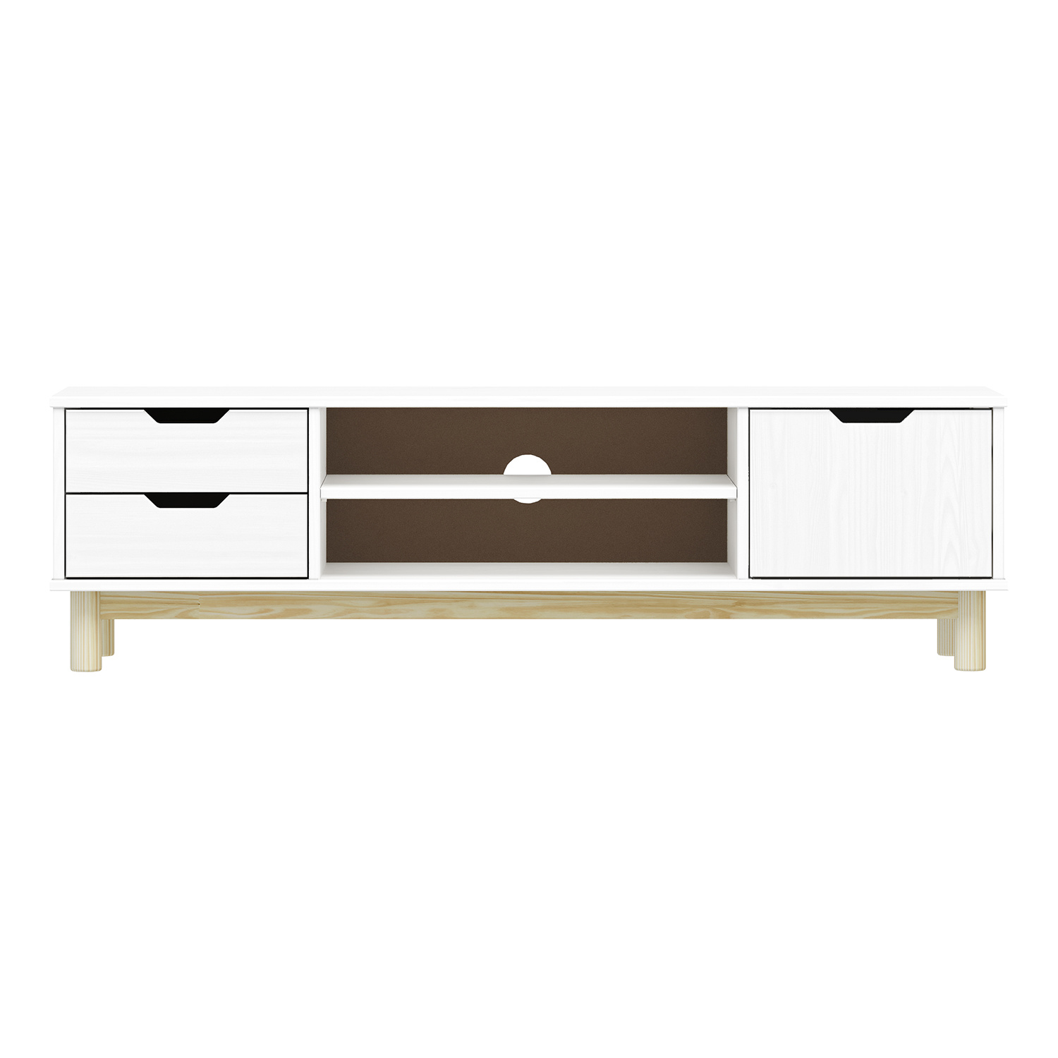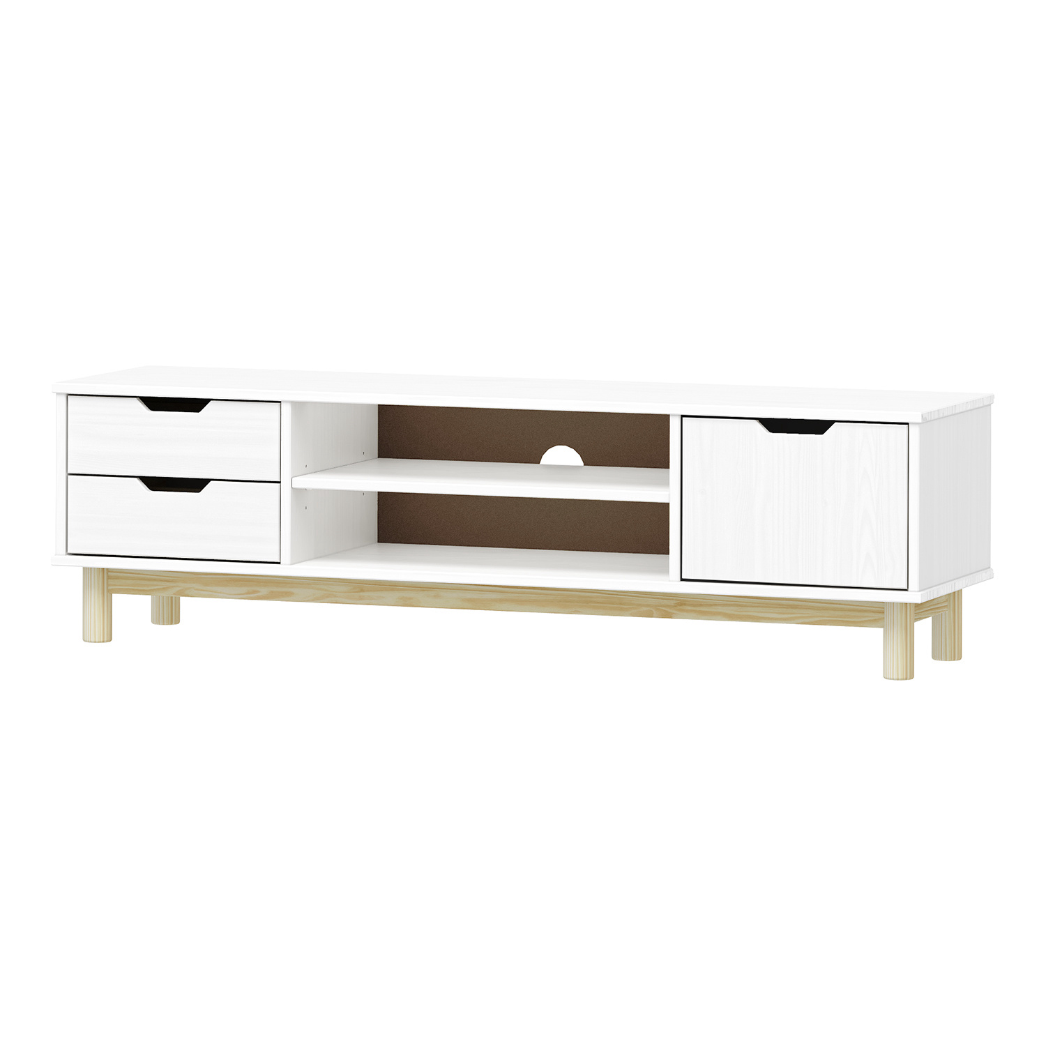 materiál masiv borovice, barevné provedení bílý lak 2 zásuvky s kovovými pojezdy, 1 dvířka, 1 police otvor na protažení kabelů