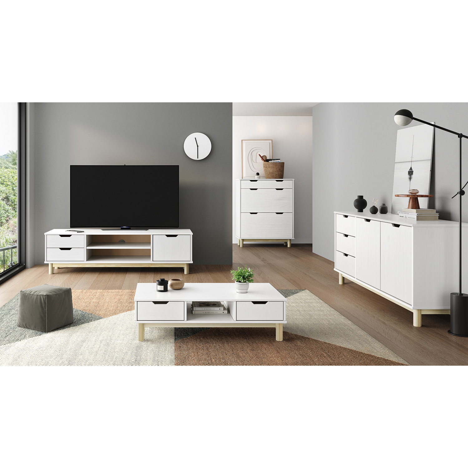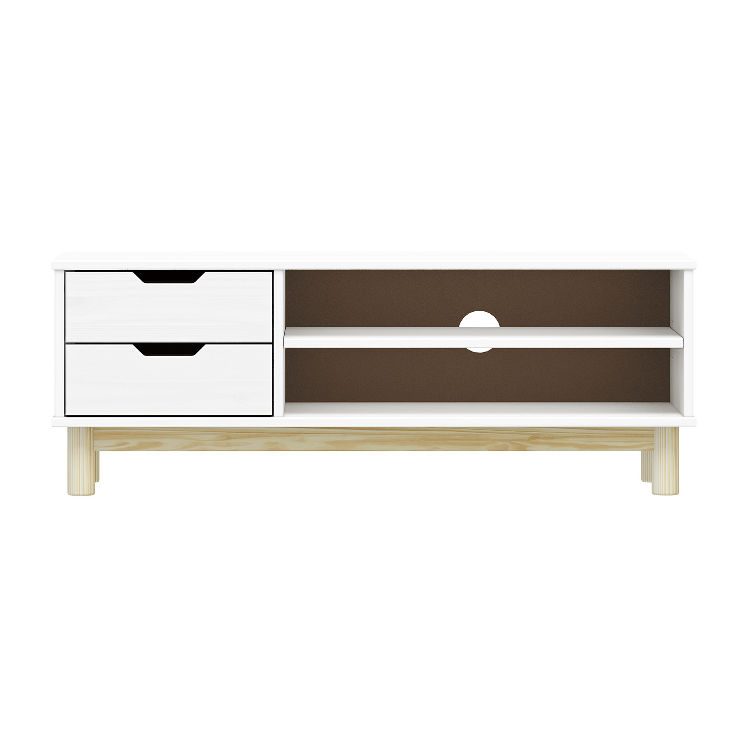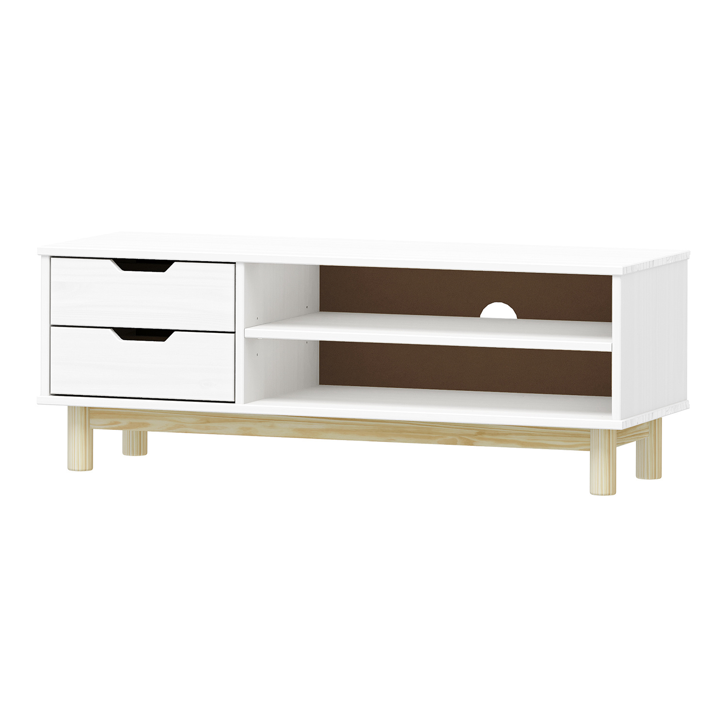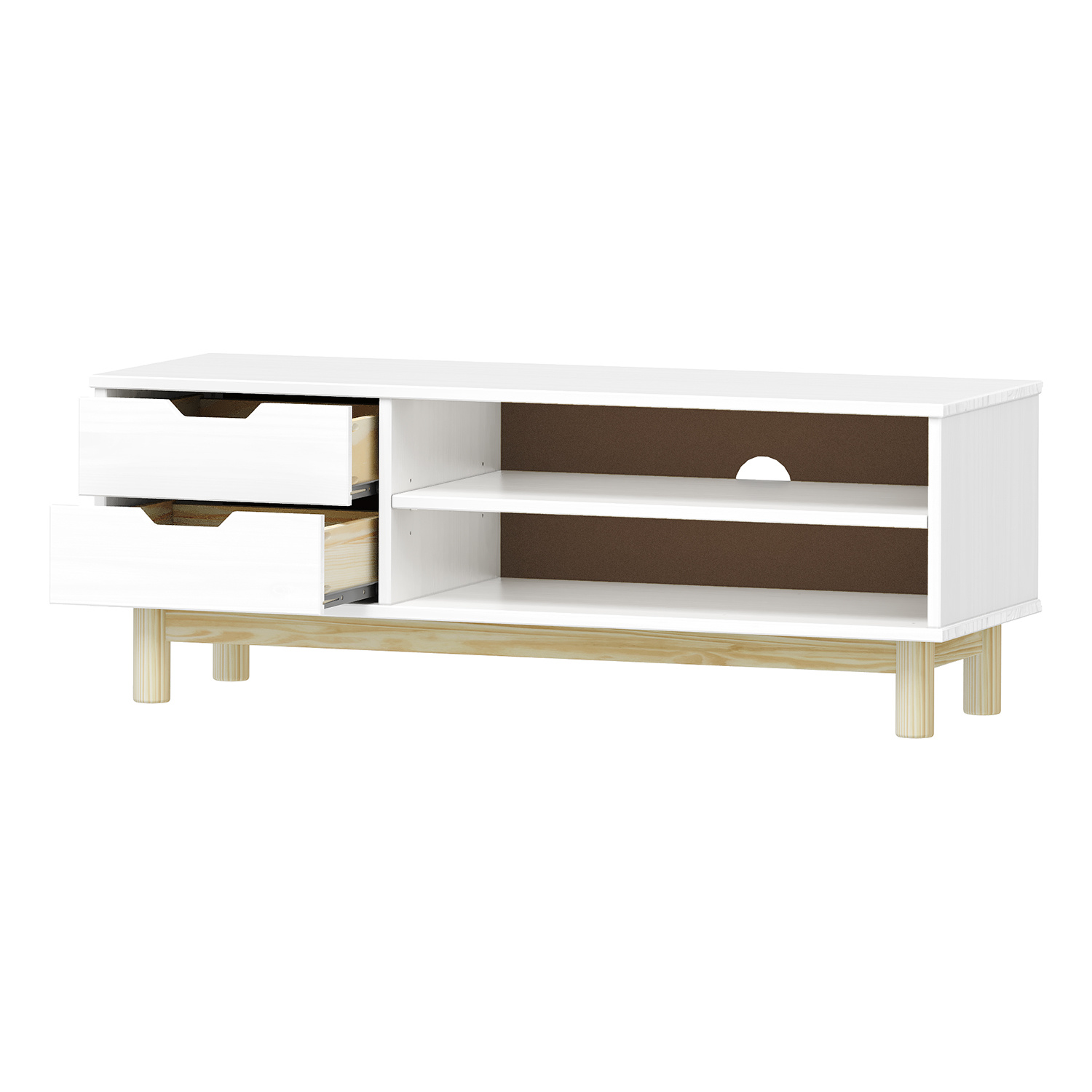 materiál masiv borovice, barevné provedení bílý lak 2 zásuvky s kovovými pojezdy, 1 police otvor na protažení kabelů