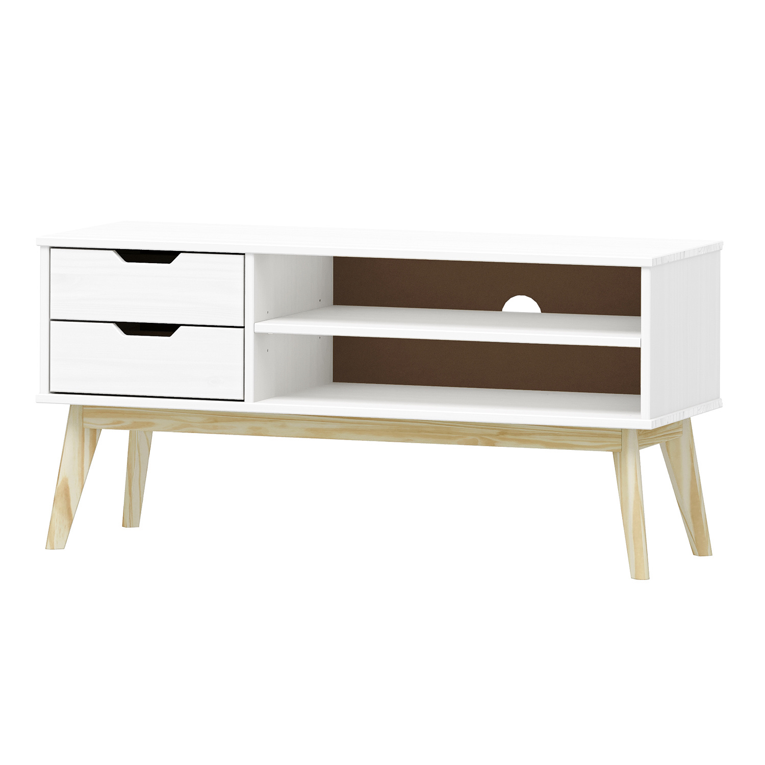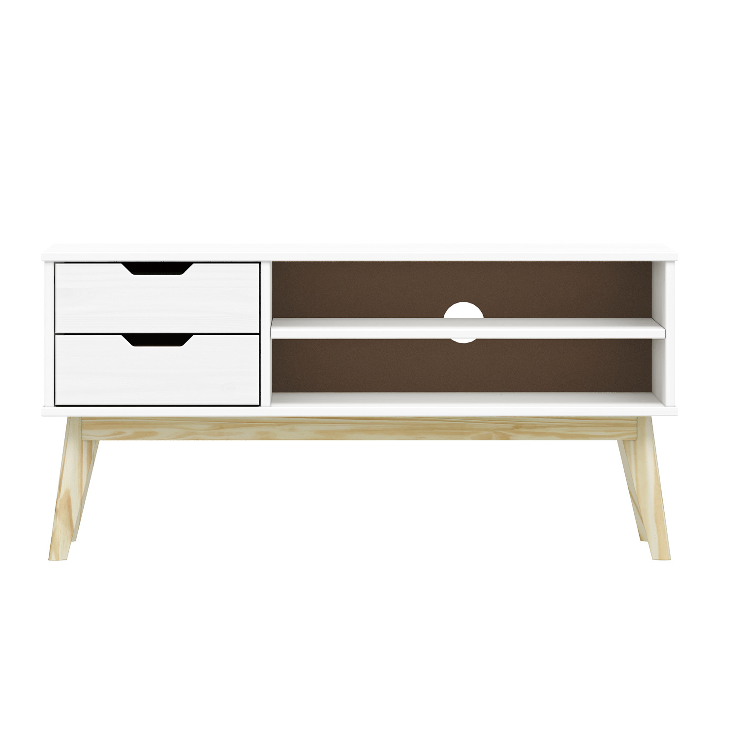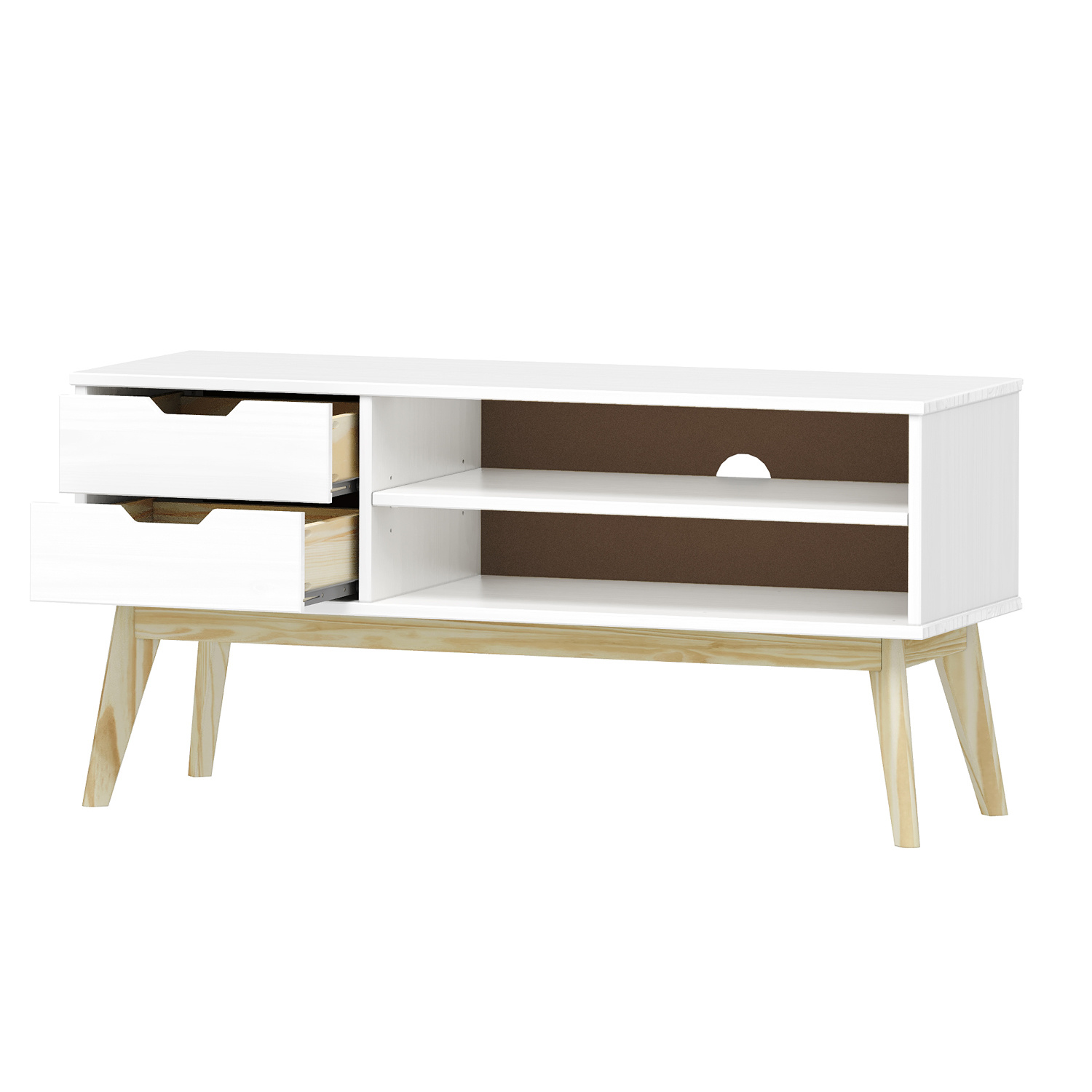 materiál masiv borovice, barevné provedení bílý lak 2 zásuvky s kovovými pojezdy, 1 police otvor na protažení kabelů