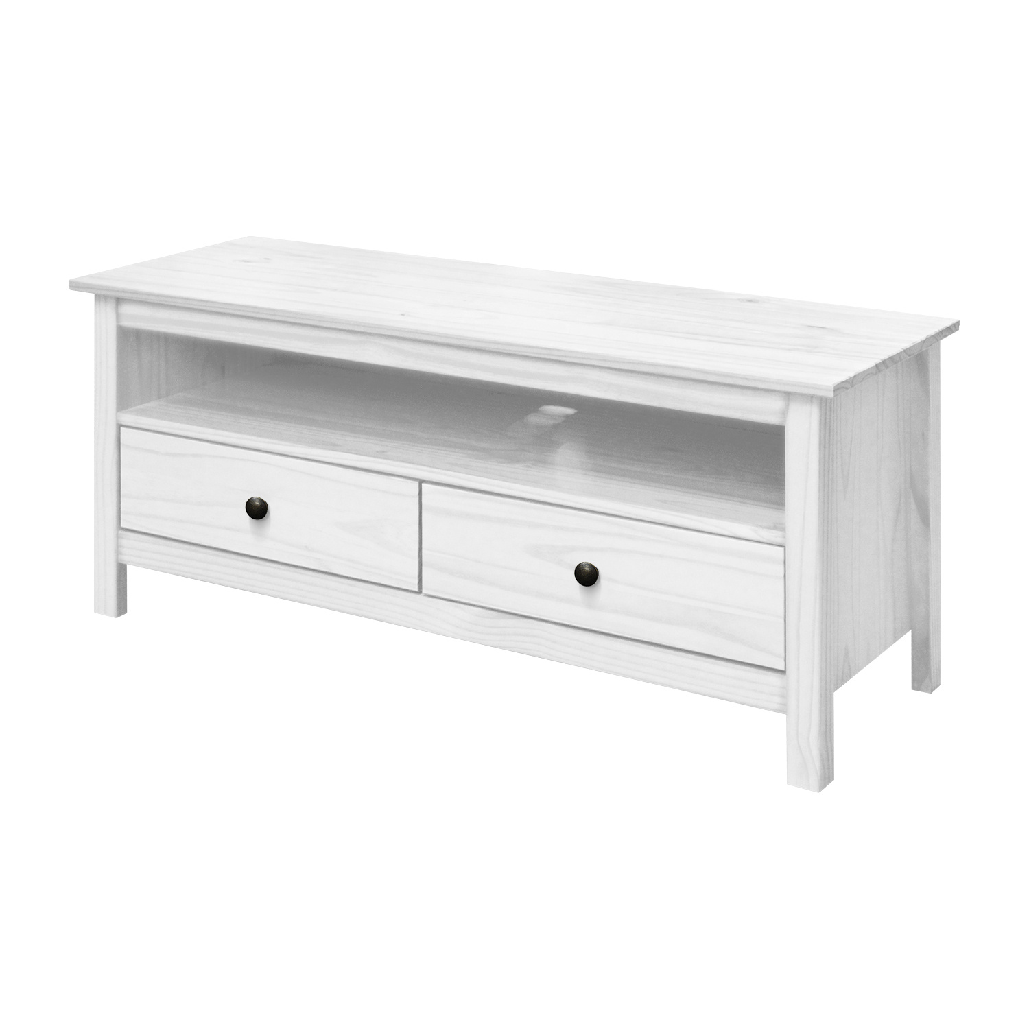 materiál masiv borovice, barevné provedení bílý lak kovové úchytky 2 zásuvky s kovovými pojezdy, 1 police