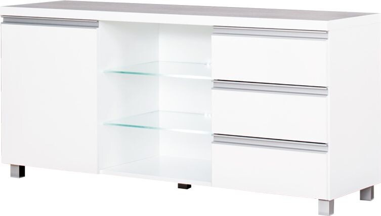 Televizní stolek Aga v barevném provedení bílá/ bílý lesk vybavený skleněnými policemi s LED podsvícením.  Zboží dodáváme v demontu.