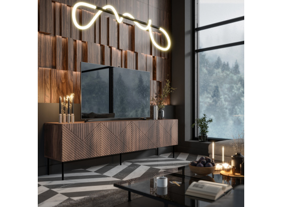 TV stolek v provedení ořech warmský má korpus z lamina, přední stranu z MDF o síle 16mm s folií, patinovánou a lakovanou. Černé kovové nožky o výšce 20 cm. Zboží dodáváme v demontu.