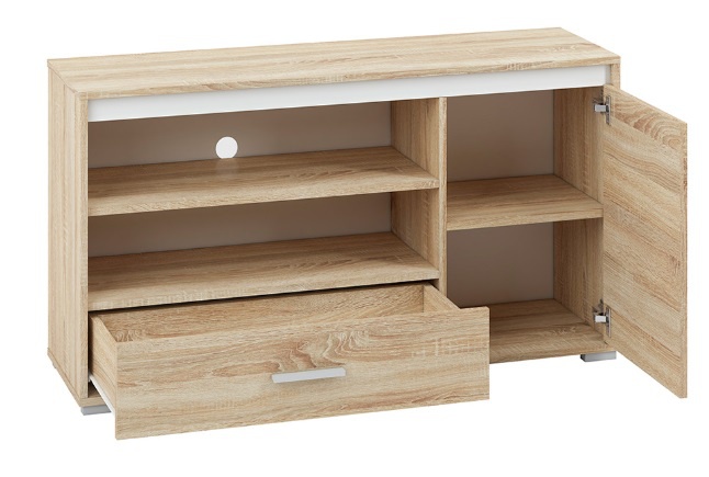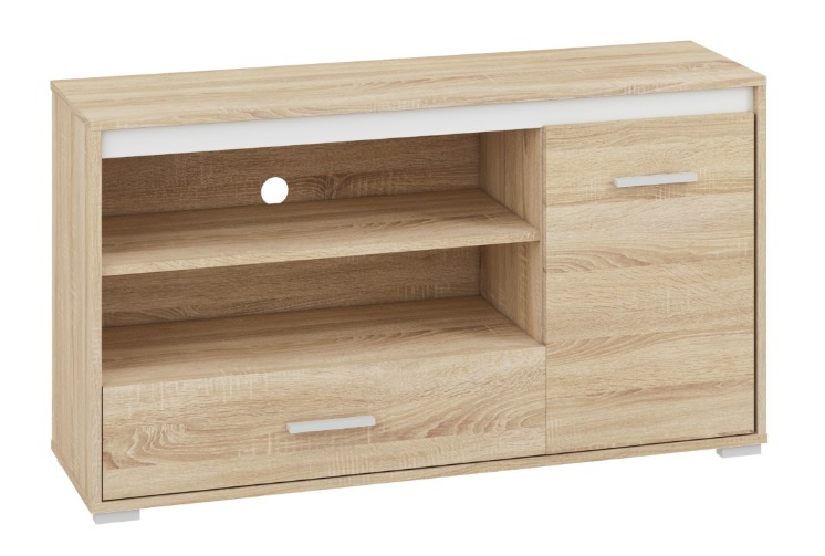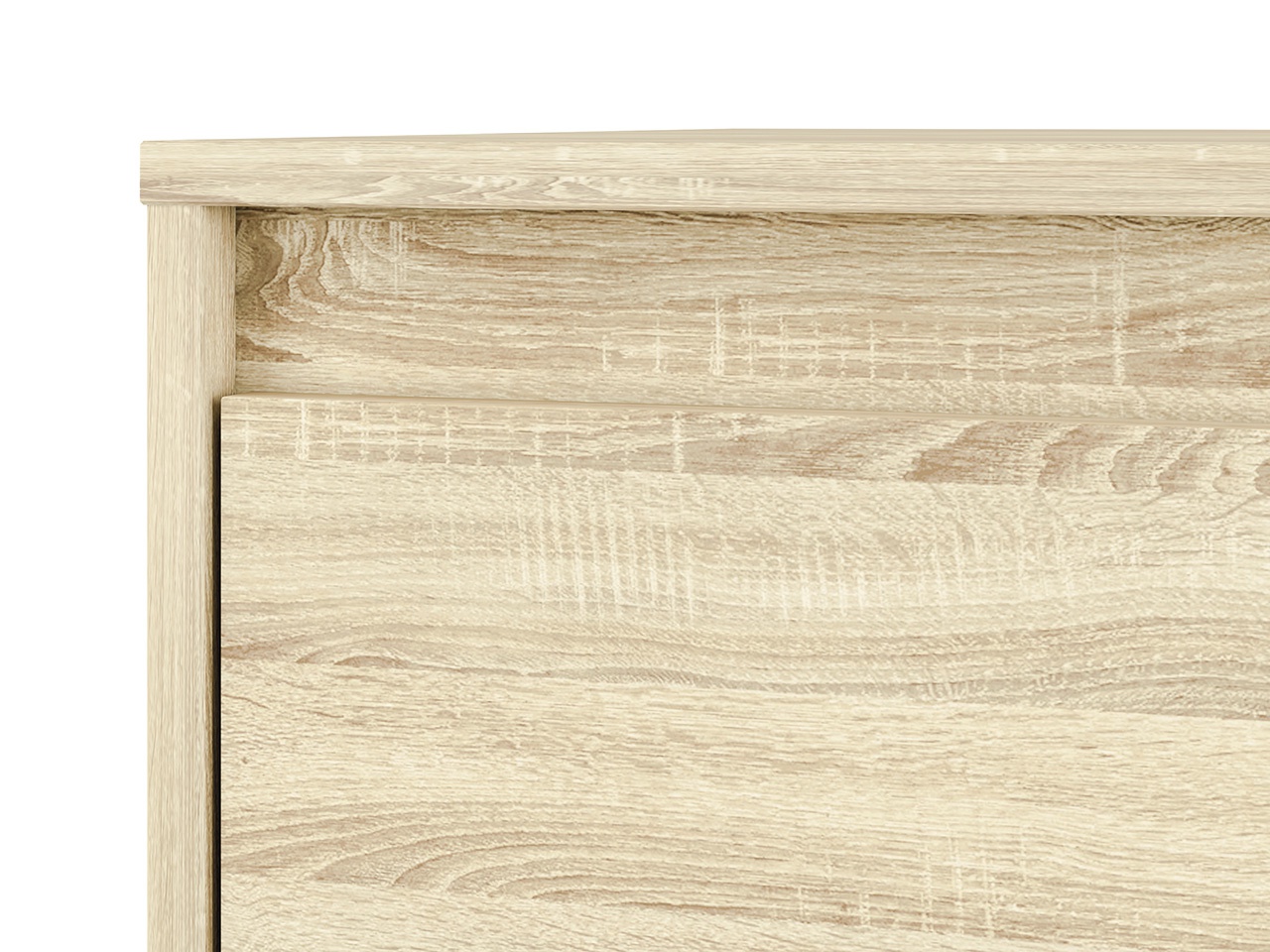 Nábytkový systém je moderní a minimalistický. Nábytek je vyroben z kvalitního lamina, které je odolné proti poškrábání, vlhkosti a vysokým teplotám. Korpus je v dezénu dub sonoma. Hrana ABS představuje stálost, odolnost proti nárazu, estetickou úpravu. Odolná proti vlhkosti, nedeformuje se a neuvolní od povrchu. Komoda má čtyři šuplíky a dvoje dvířka. Zboží je dodáváno v demontu.