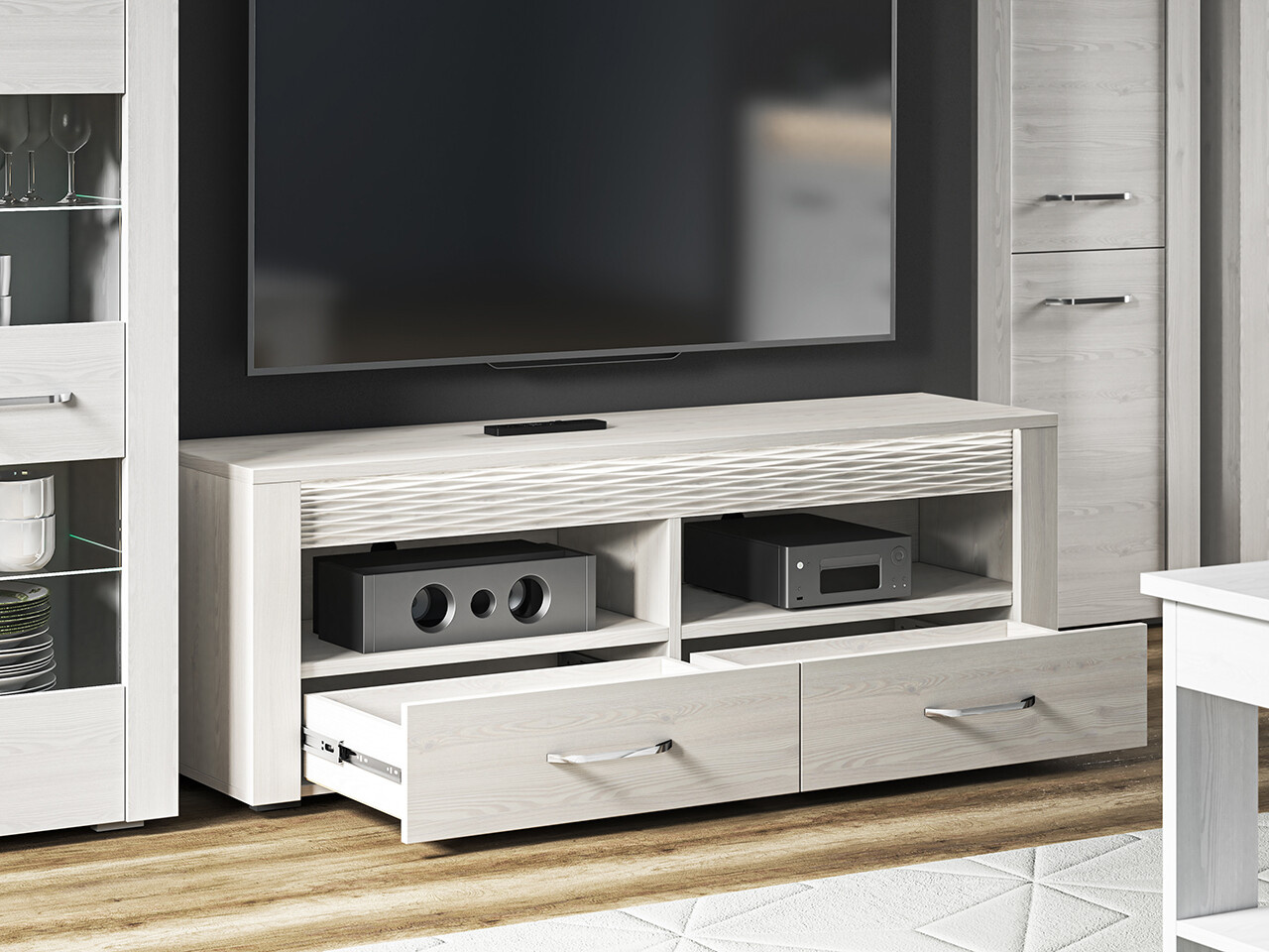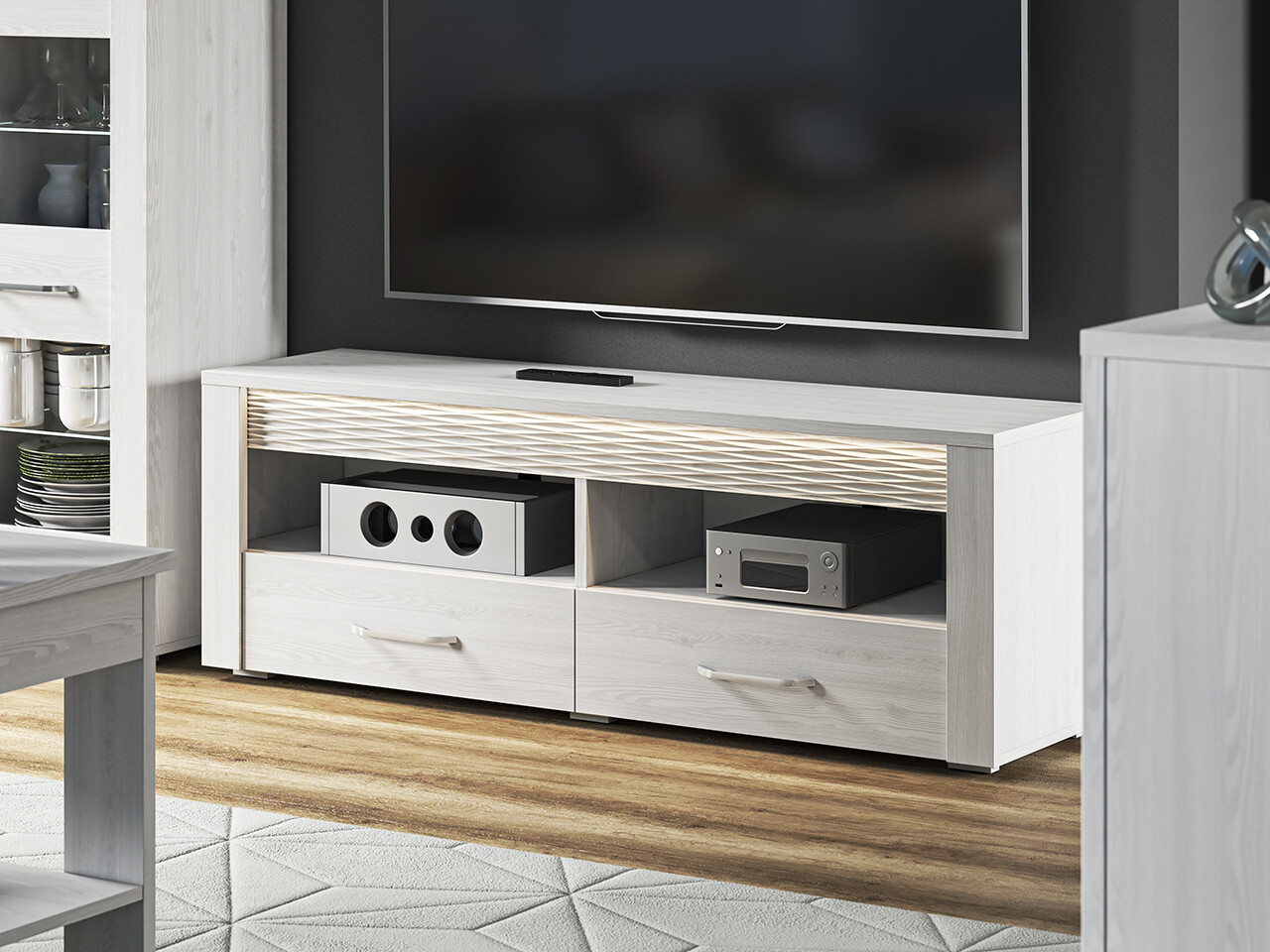 TV stolek Clermont je vyrobena z vysoce kvalitní laminované dřevotřískové desky s ABS hranou korpus v  dezénu borovice sněžná. Zboží dodáváme v demontu.