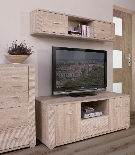Moderní tv stolek je vyroben z kvalitního lamina. Korpus i dvířka jsou v dezénu dub sonoma. Dekorační lišty na nábytku jsou MDF. Úchytky na zásuvkách jsou z plastu a pojezdy zásuvek kovové kuličky. Díky eleganci a funkčnosti jednotlivých dílů je vybavení obývacího pokoje, jídelny nebo pracovny velmi snadnou záležitostí. Nábytek z kolekce GRESS je navržen tak, aby i jednotlivě vkusně doplnil výbavu pokojů. Společně pak tvoří elegantní řešení výbavy vašeho bytu. Zboží dodáváme v demontu.