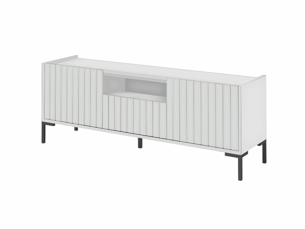 Tv stolek ze systému Lando má konstrukci vyrobenou z kvalitního lamina v matné bílé barvě. Nožky jsou kovové v matné černé barvě. Členění skříňky: 2x dvířka, 1x zásuvka a 1x otevřená police. Zboží dodáváme v demontu.