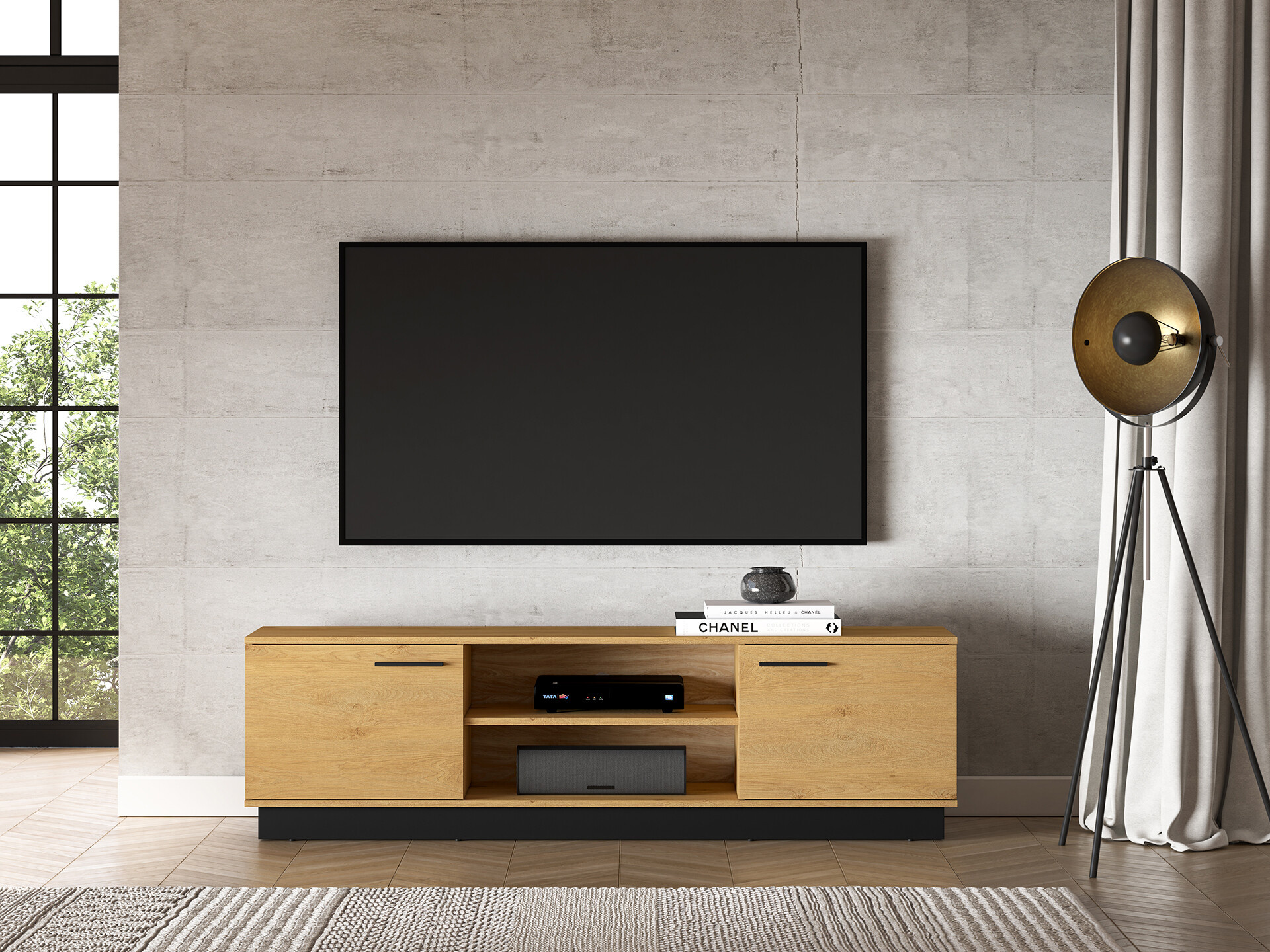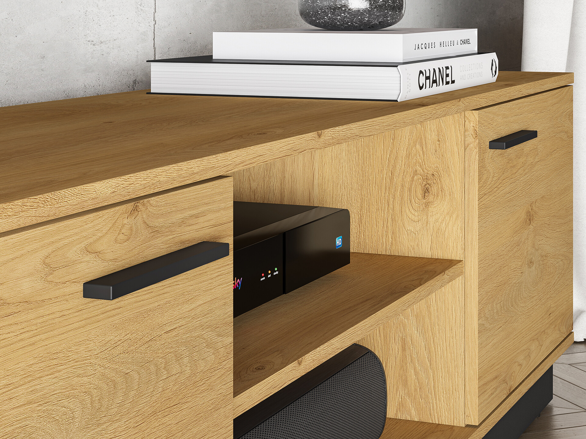 TV stolek Modesto je vyrobena z vysoce kvalitní laminované dřevotřískové desky s ABS hranou v provedení dub stylový/ černá. Zboží dodáváme v demontu.