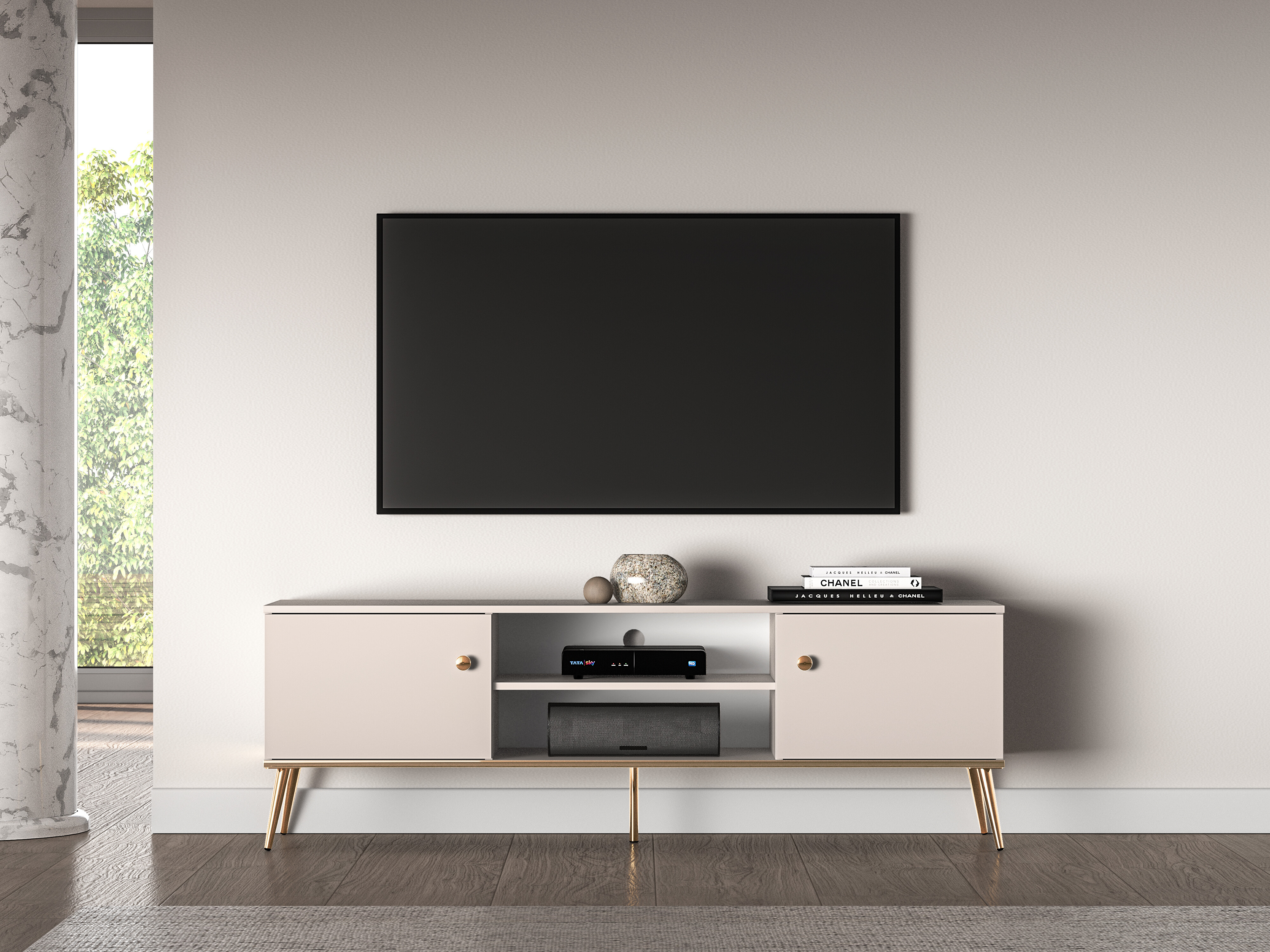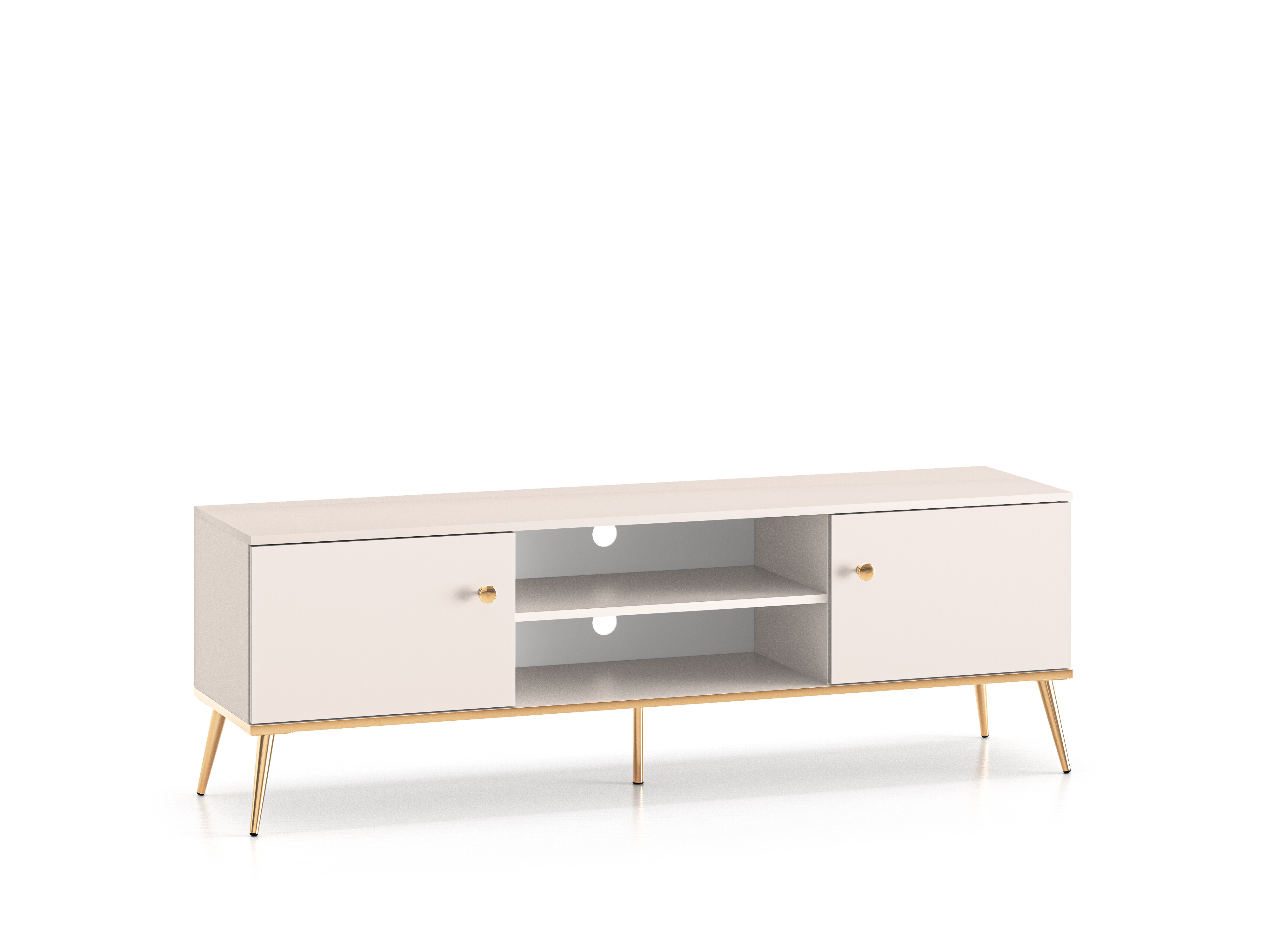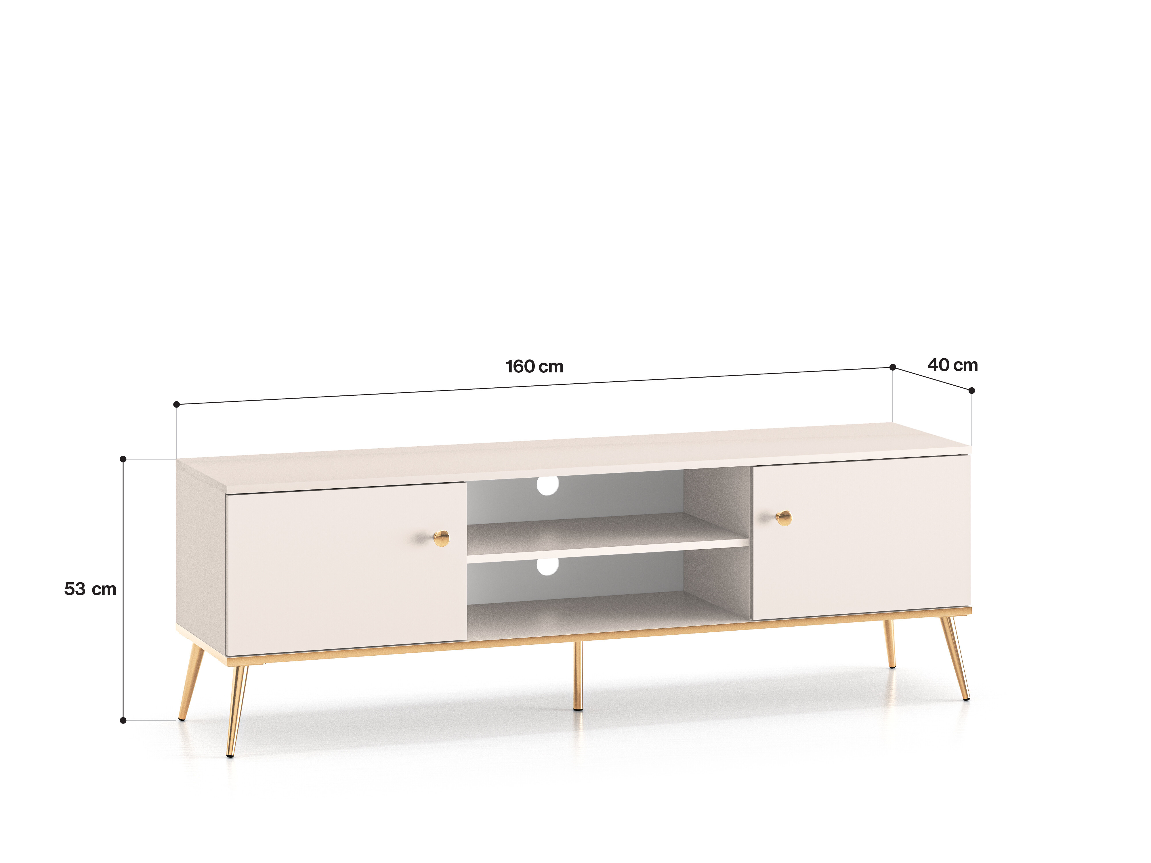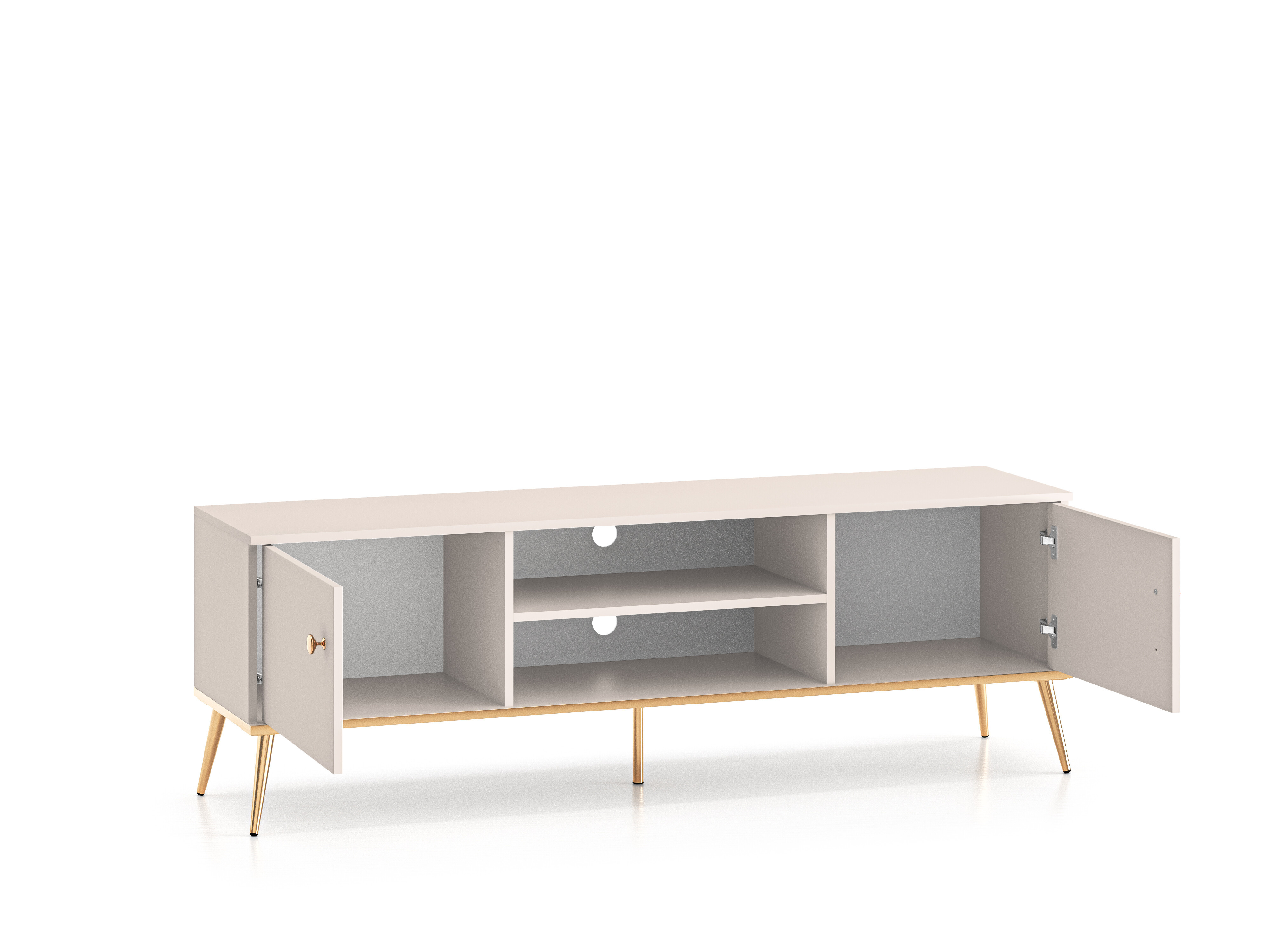 Tv stolek je vyrobená z kvalitního lamina v bílém provedení. Stabilní vysoké nohy v kovovém provedení a dvojitě pozinkovaná rukojeť jsou ve zlatém provedení. Zboží dodáváme v demontu.