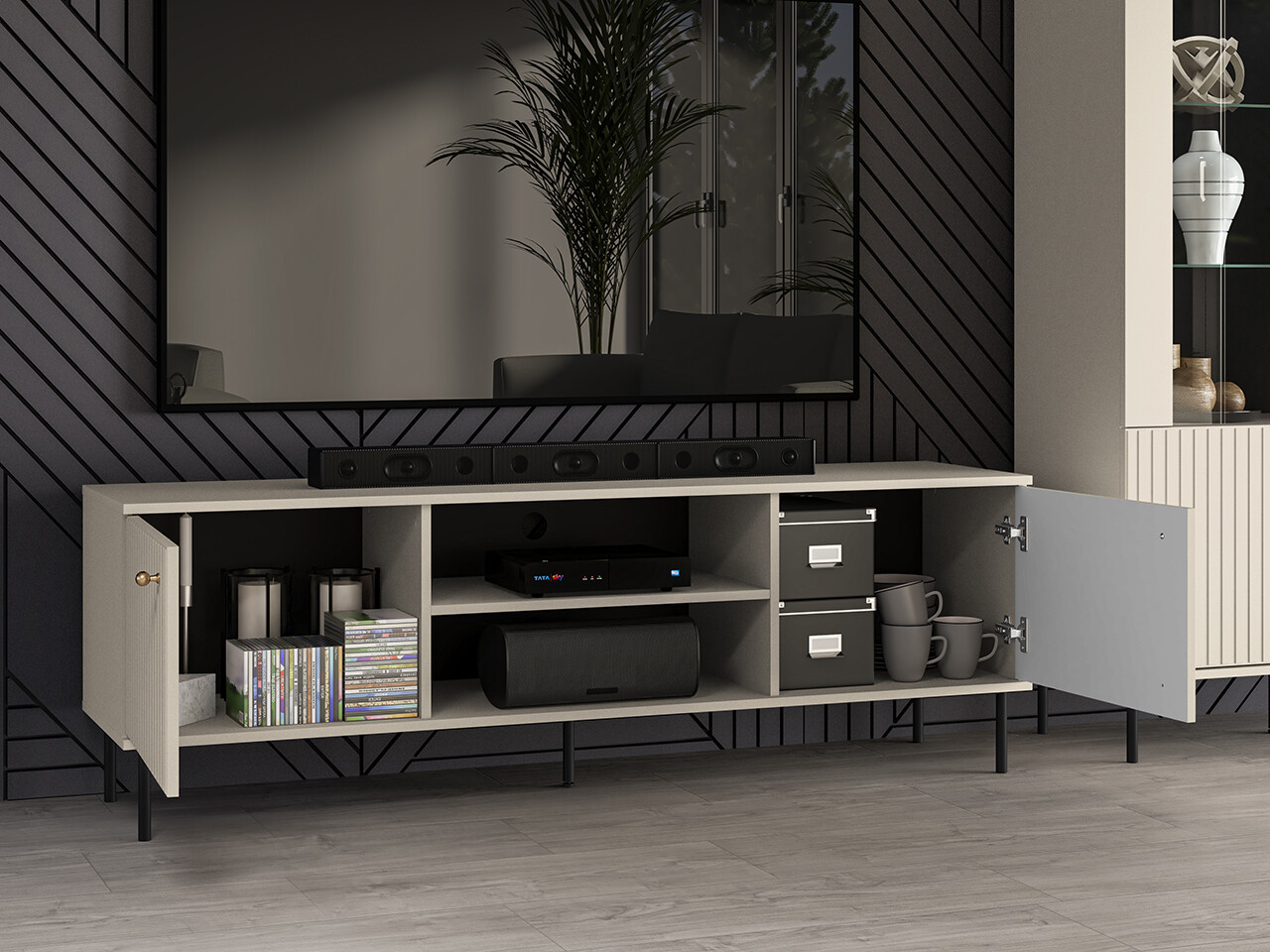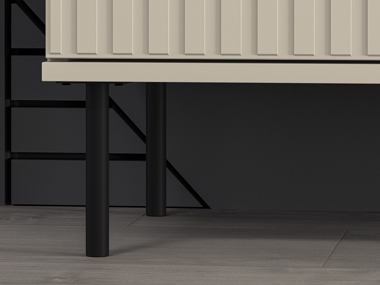 TV stolek SOPHIE je vyrobena z vysoce kvalitní laminované dřevotřískové desky s ABS hranou v kašmírové barvě. Vyznačuje se stylovými černými kovovými nohami a drážkovanými předními čílky se zlatými úchytkami. Kuličkové vodítka a panty s tichým zavíráním zajišťují komfort používání. Zboží dodáváme v demontu.