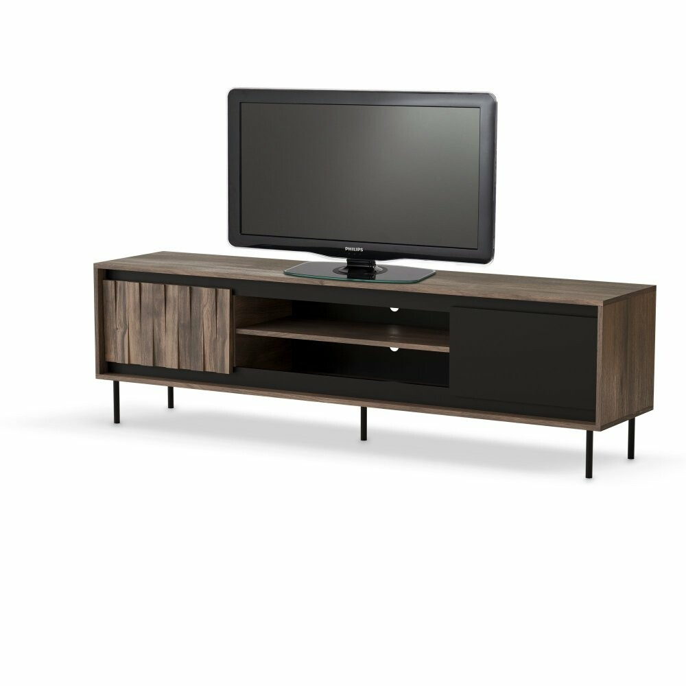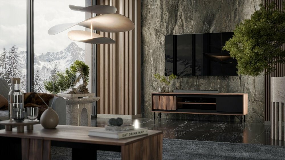 TV stolek je vyrobena z laminované desky, foliované MDF a oceli s práškovým nástřikem. Barva kombinuje ořech a černou, a 3D struktura dodává komodě zajímavý vzhled. Zboží dodáváme v demontu.