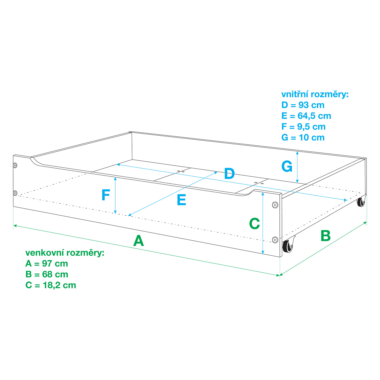 Materiál masiv borovice, lakované provedení, úložný prostor je pojízdný na kolečkách. Rozměry 97 x 68 x 18 (š x h x v). Zboží je dodáváno v demontu.