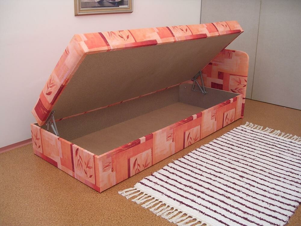 Celočalouněná válenda s úložným prostorem. Kostra je tvořena kombinací masivu a velkoplošných materiálů ( DTD ). Lehací plocha je tvořena pružinovou kostrou (tlačné pružiny) v kombinaci s tvrzenou plstí, zátěžovou pěnou PPUR RE 80 a rouna. K válendě je možné doobjednat dlouhé čelo nebo krátké čelo.
