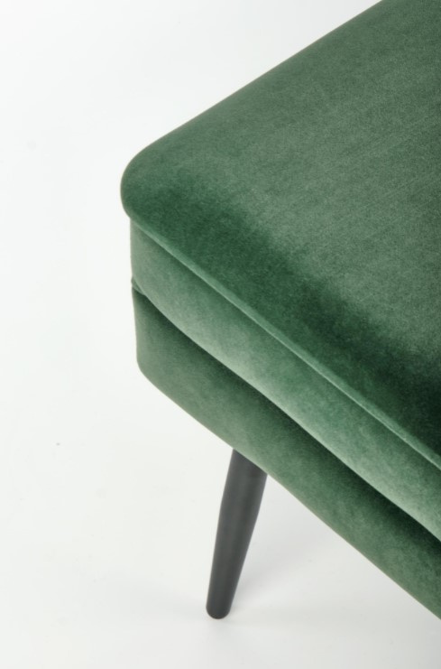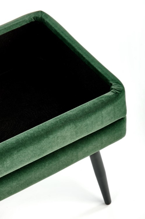 Moderní sametový taburet v zelené barvě s úložným prostorem, doplněný o nohy z práškované oceli v černé barvě.