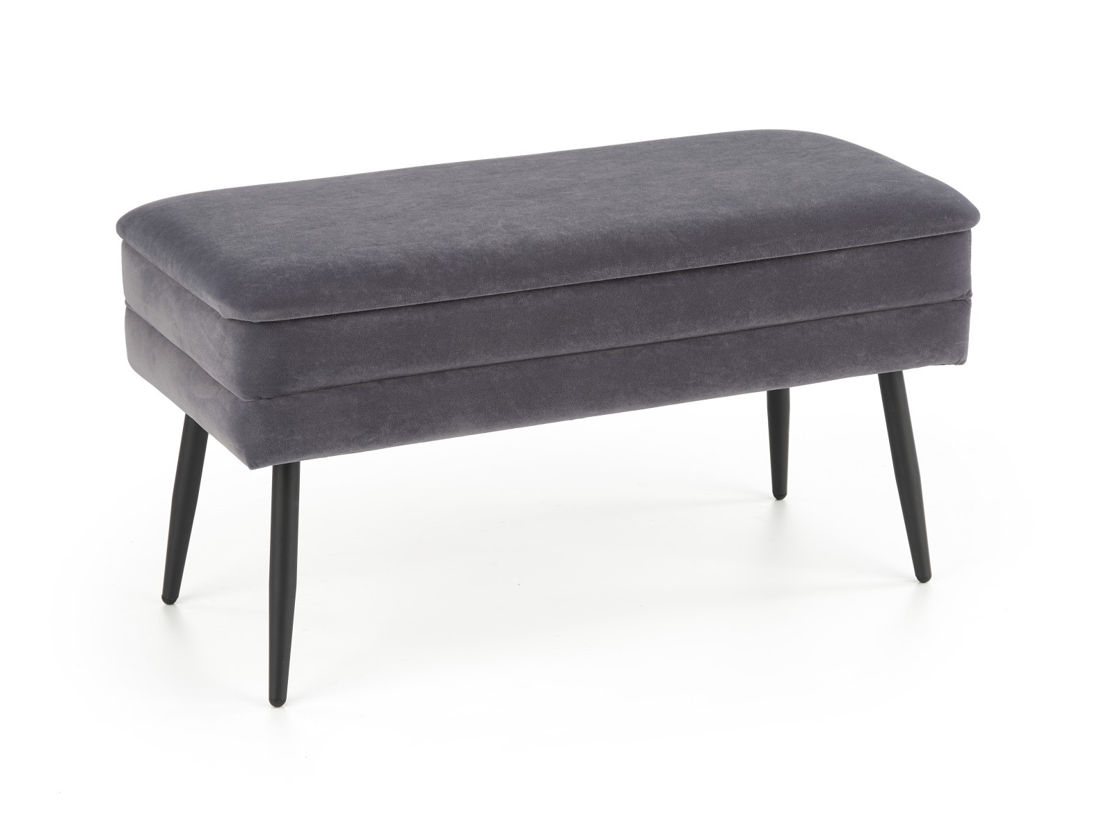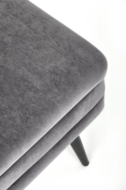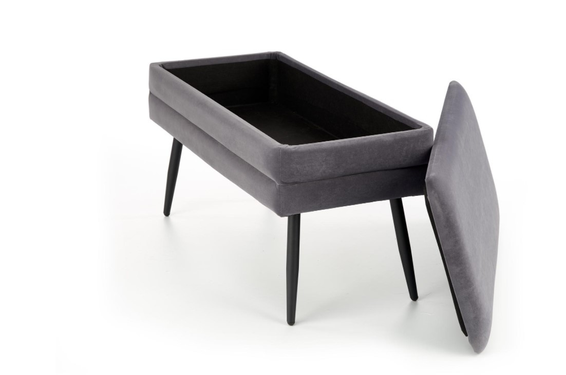 Moderní sametový taburet v šedé barvě s úložným prostorem, doplněný o nohy z práškované oceli v černé barvě.