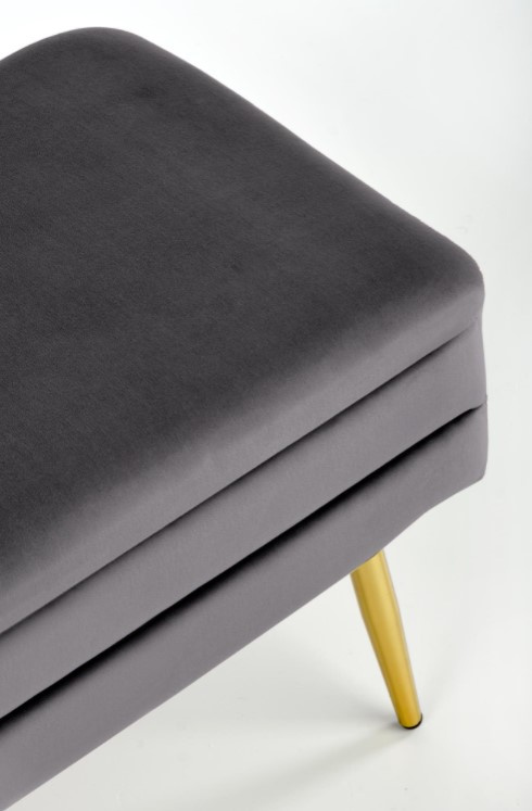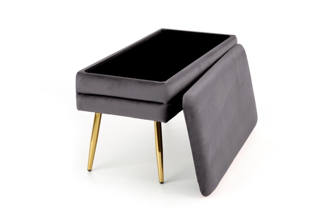 Moderní sametový taburet v šedé barvě s úložným prostorem, doplněný o nohy z chromované oceli ve zlaté barvě.