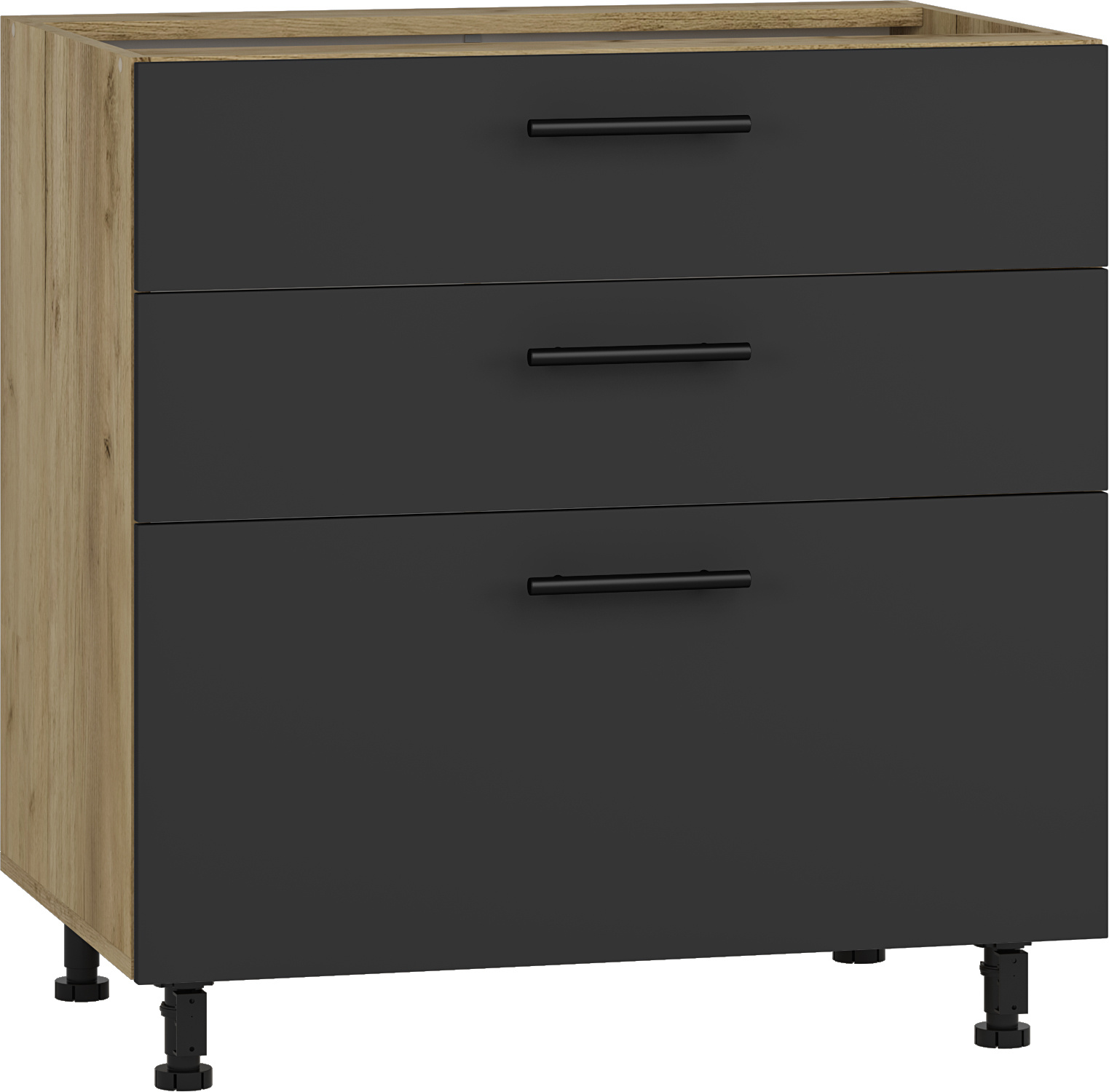 Šuplíková dolní skříňka má korpus z lamina v barvě dub craft, dvířka jsou z materiálu MDF v barvě antracyt lesk. Šuplíky jsou vybaveny pojezdy typu Hettich. Dolní skříňka má regulované nožky. Výška skříněk je bez pracovní desky. Pracovní deska ani sokl nejsou součástí. Zboží je dodáváno v demontu.