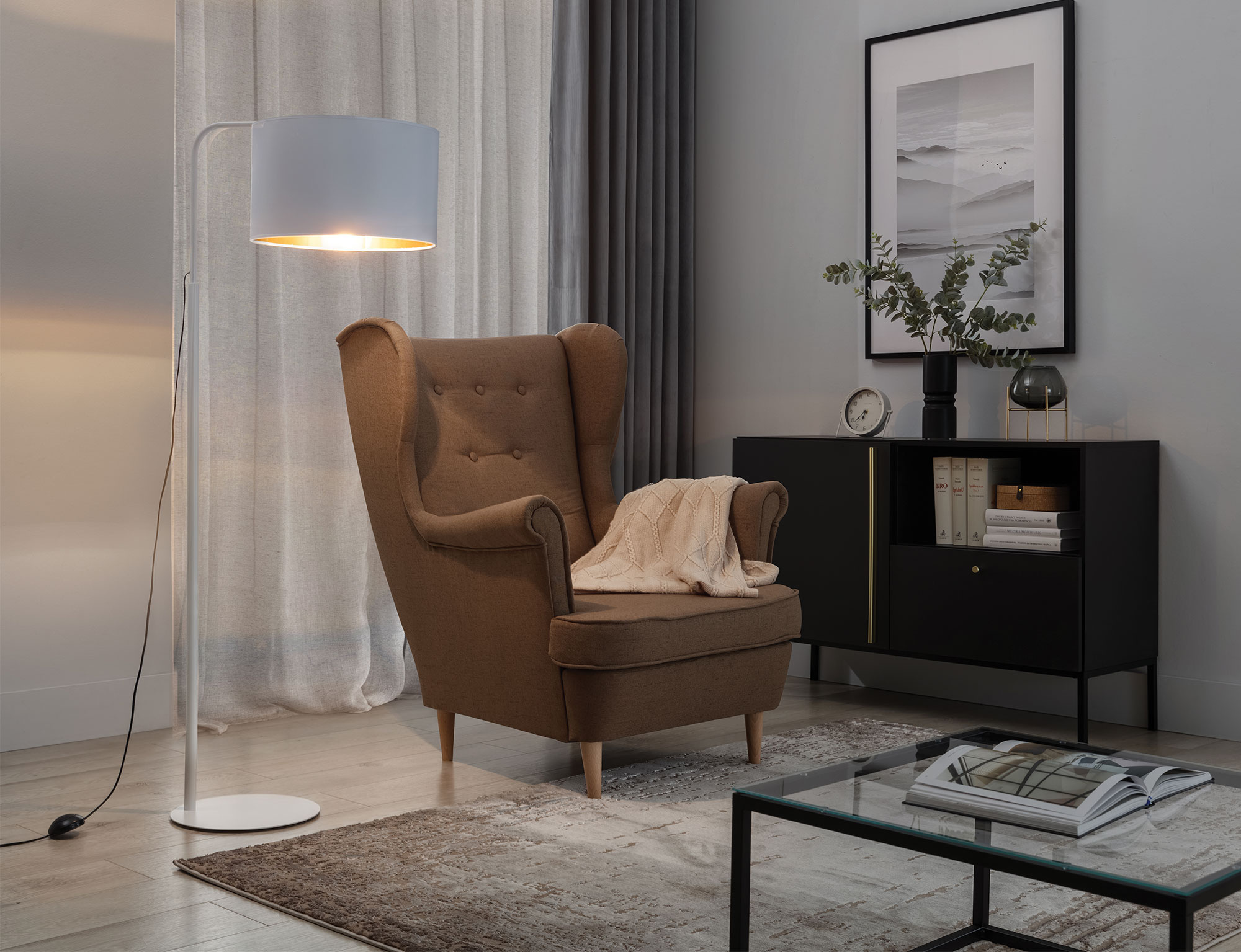 The Vespillo floor lamp is an elegant and functional lighting option, ideal for various interiors. It features a light source with a maximum power of 15 W, providing pleasant and non-glaring illumination. The lampshade is made of PVC fabric, giving it a modern and stylish look, while allowing gentle light diffusion to create a cozy atmosphere. The lamp's base is sturdily constructed from steel, ensuring durability and stability. It has an E27 socket, allowing for easy fitting of different bulbs.