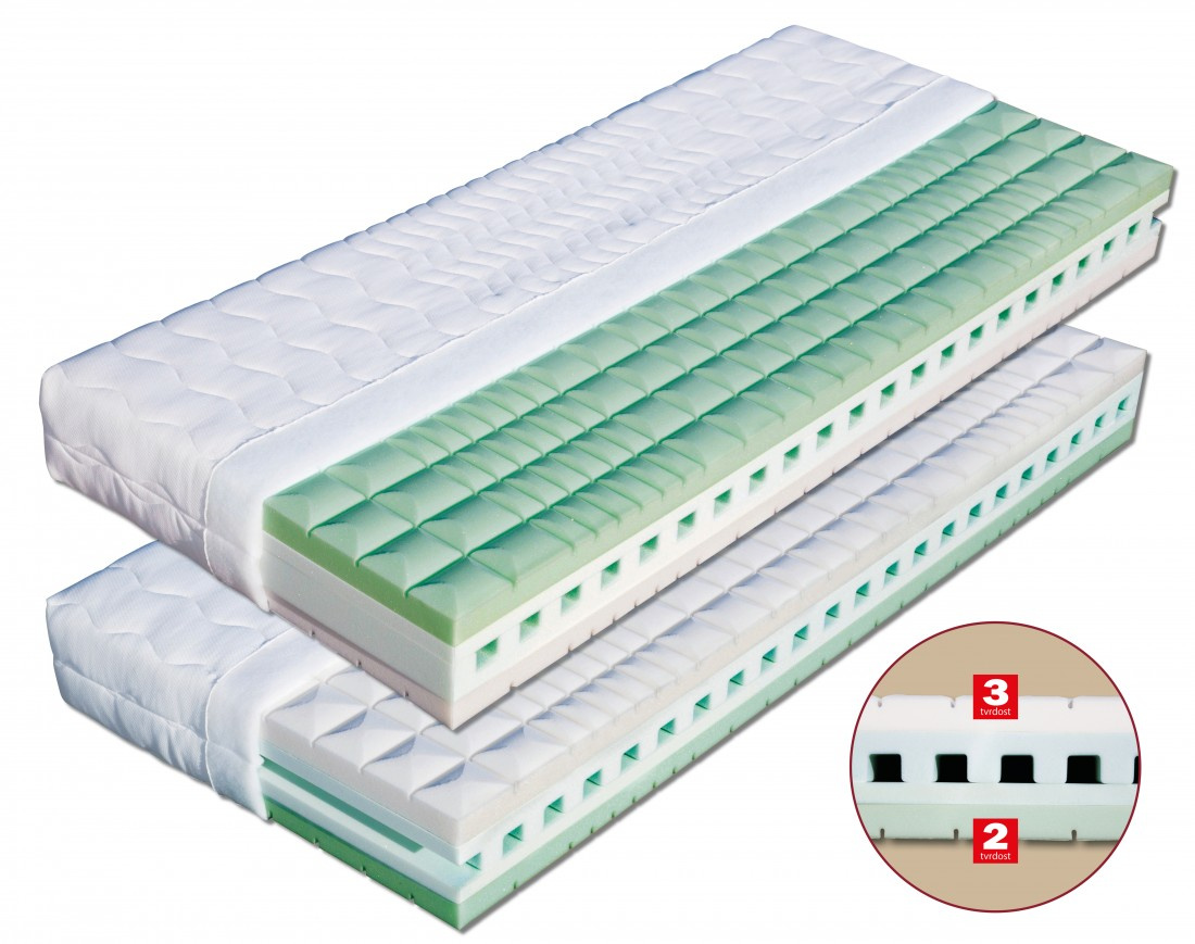 Matrace s jádrem s unikátně provzdušněným řezem. Tento zákazníky časem prověřený profil je složen z tvrzené pěny MediFoam s vysokou gramáží (40 kg/m³). Vrchní a spodní vrstvu tvoří pěny MediFoam (28 a 30 kg/m³). Mají antidekubitní prořez a celkově tuto plochu výborně provzdušňují. Tuto matraci je díky řezu vhodné uložit i na neprodyšnou pevnou desku. Je vhodná pro všechny typy roštů, včetně polohovacích. Matrace lze vybrat v potahu SILVERGUARD,MEDICOTT,LYOCELL - antibakteriální potah nebo LEVANDULE - s relaxačními účinky. V objednávce prosím uveďte Vámi vybraný potah. Výška matrace včetně potahu 23 cm. Matrace do hmotnosti 130 kg. K této matraci nabízíme jako dárek zdarma 1x polštář Lukáš.