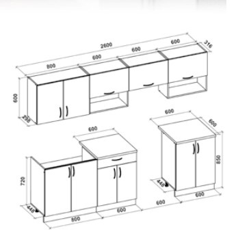 - horní skříňka 80 cm s dvířky, horní skříňka 60 cm s poličkou, horní skříňka 60 cm - digestoř, horní skříńka 60 cm s poličkou.