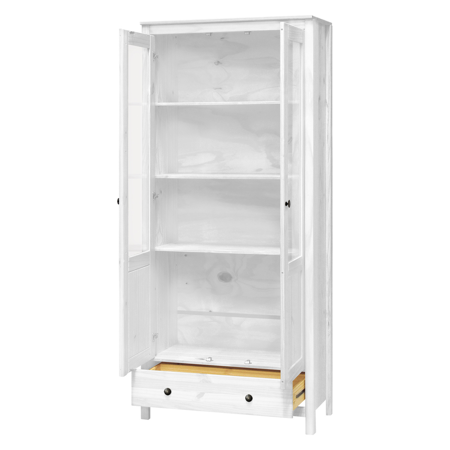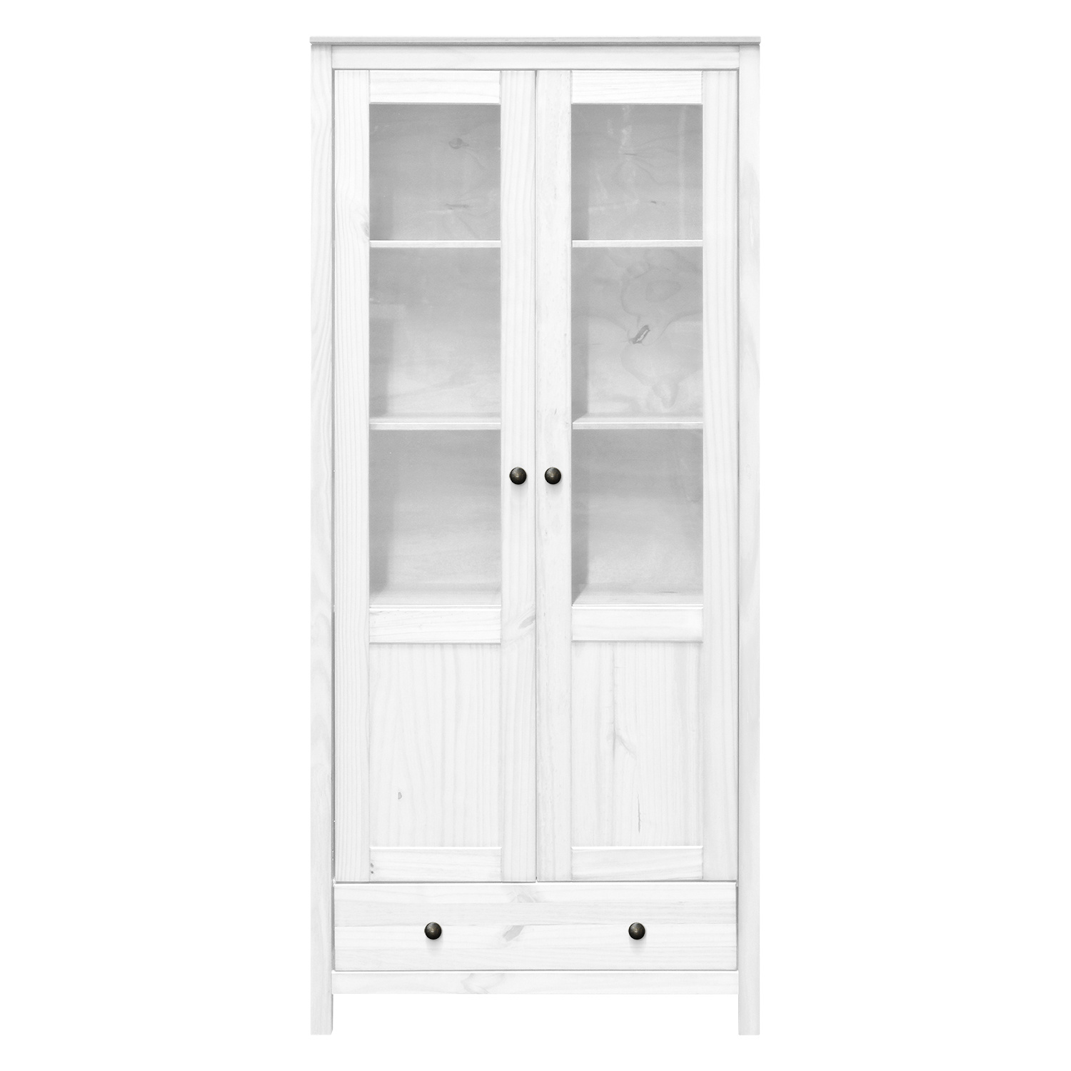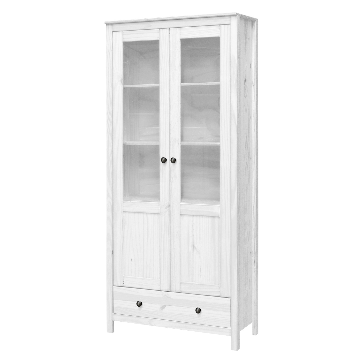 materiál masiv borovice, barevné provedení bílý lak kovové úchytky dvoje částečně prosklené dveře, tři police jedna zásuvka s kovovými pojezdy