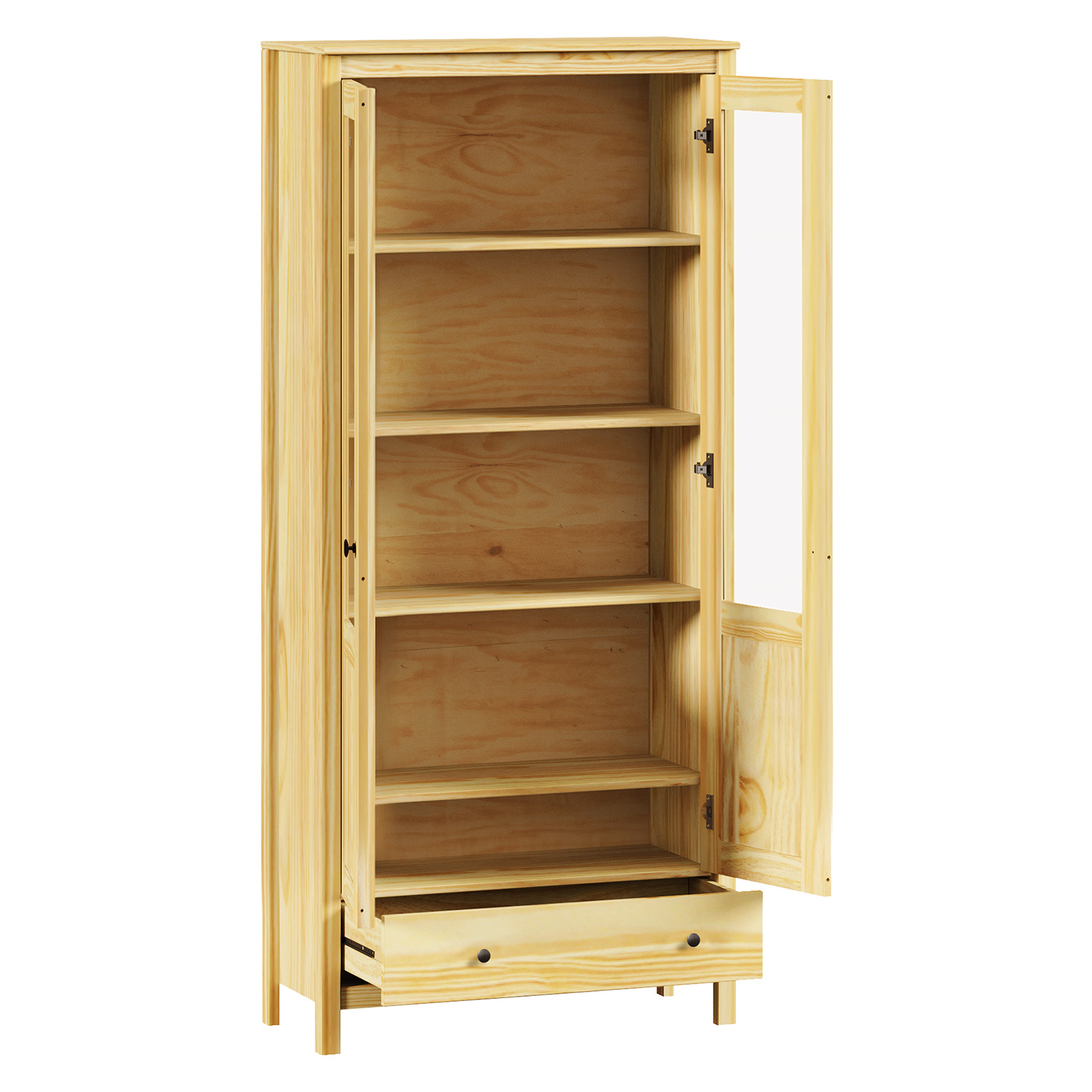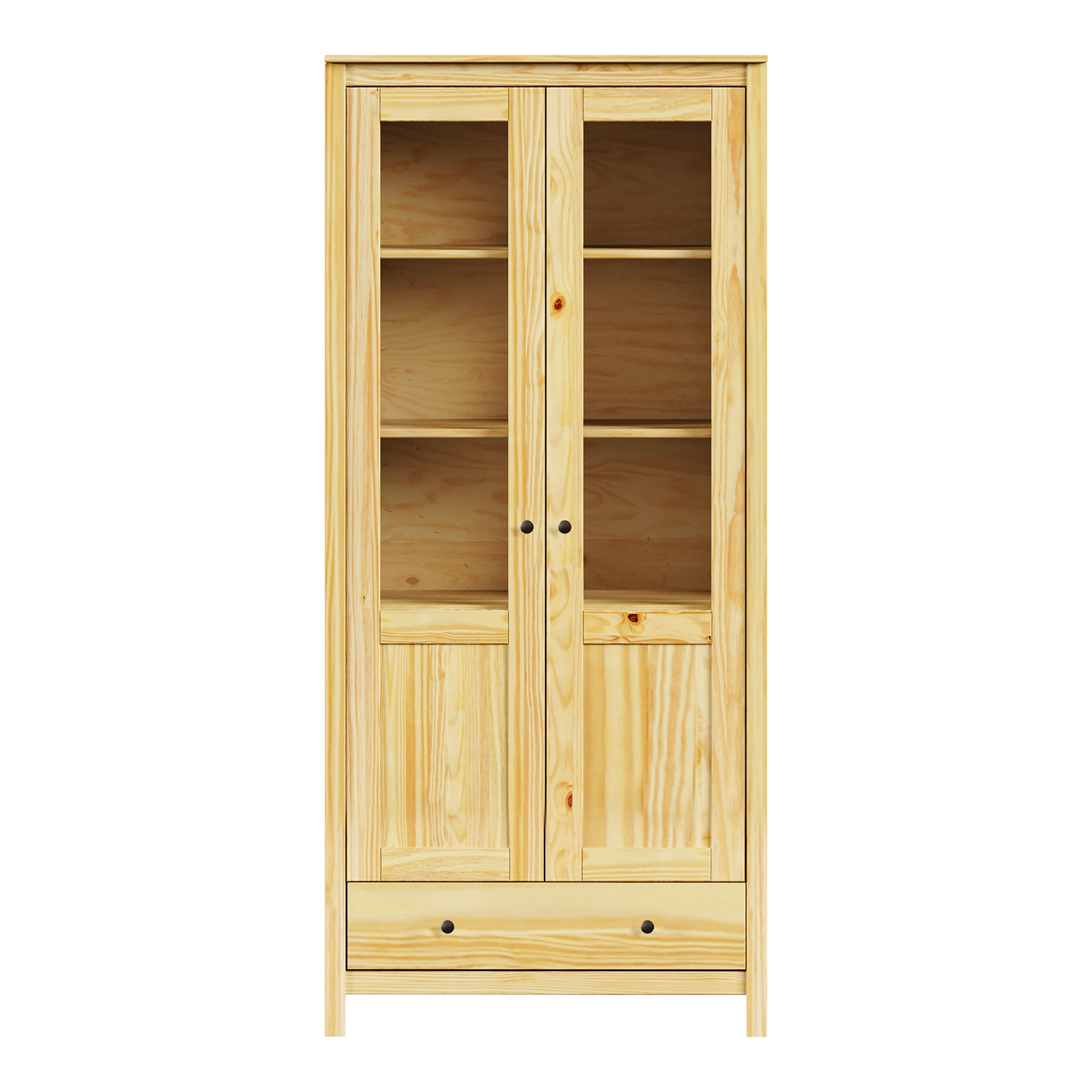 materiál masiv borovice, lakované provedení kovové úchytky dvoje částečně prosklené dveře, tři police jedna zásuvka s kovovými pojezdy