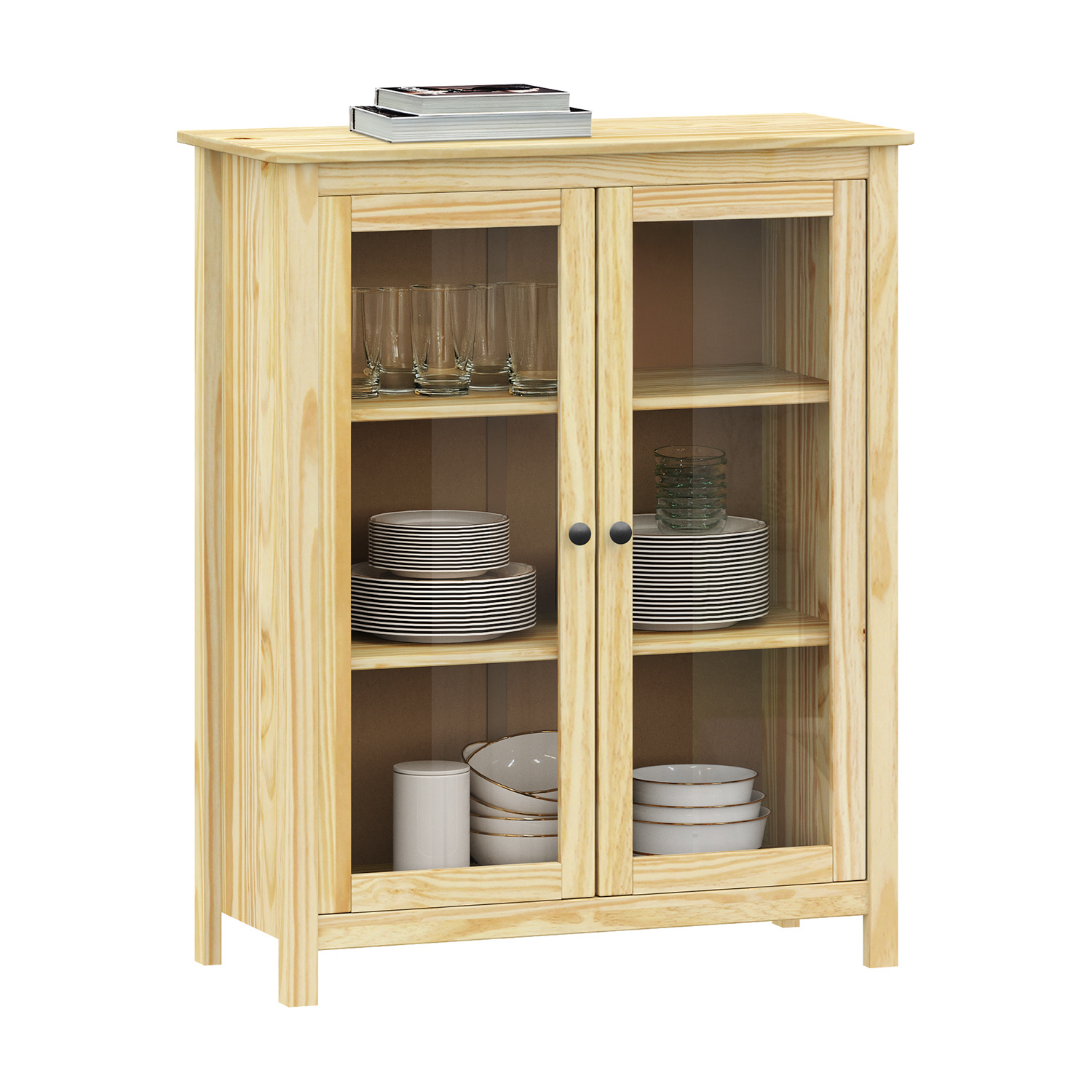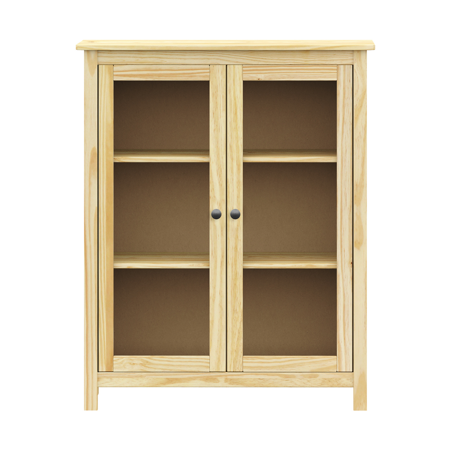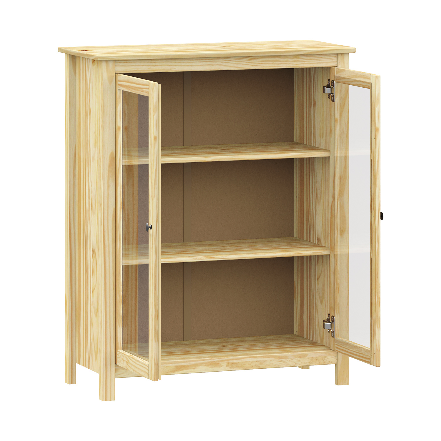 materiál masiv borovice, lakované provedení kovové úchytky v barevném provedení černěná mosaz 2 prosklené dveře, 2 police maximální nosnosti uvedeny v návodu k montáži