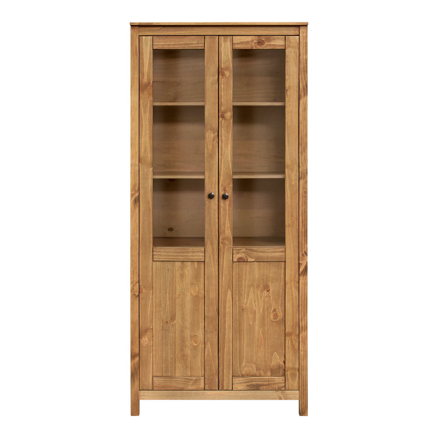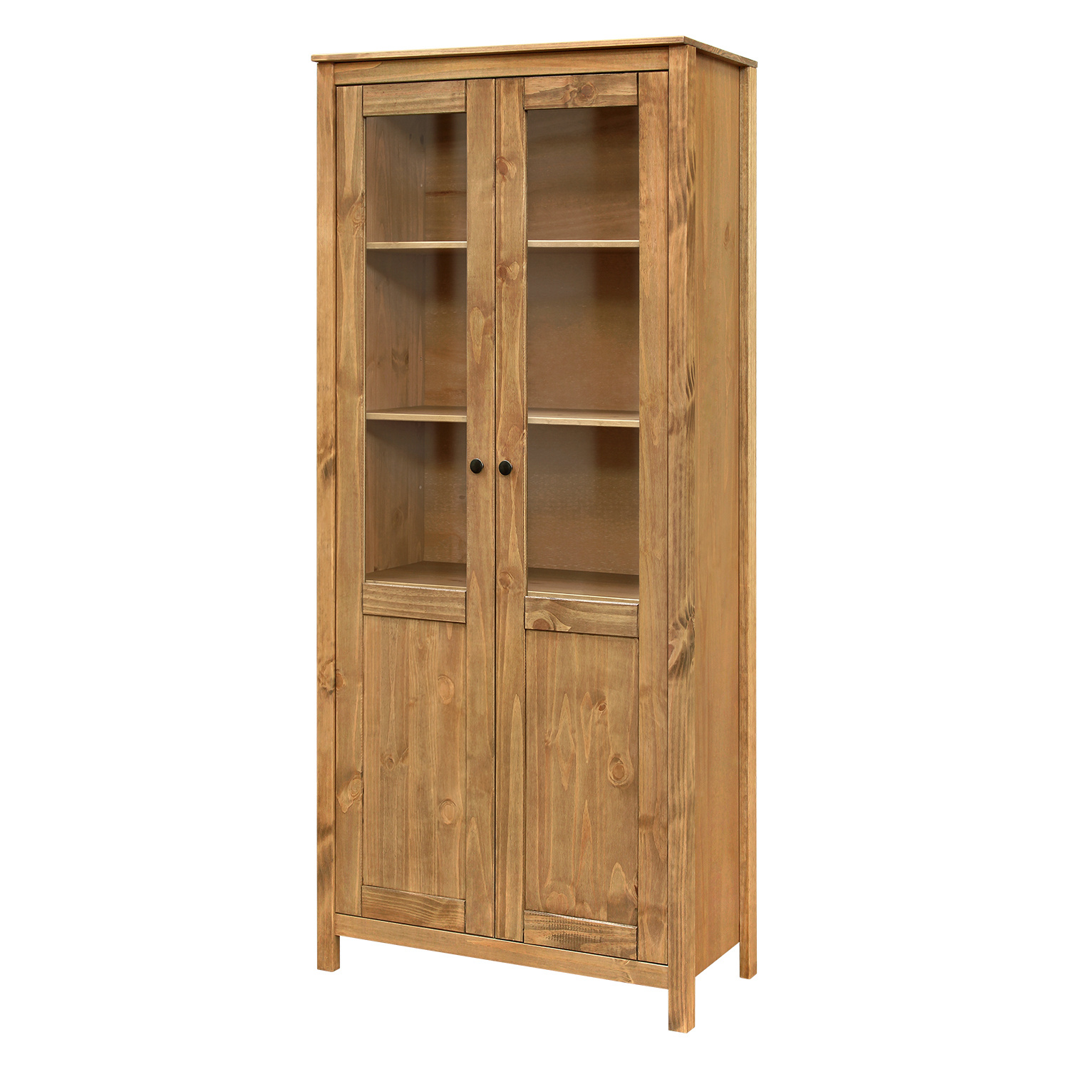 materiál masiv borovice voskovaná v medovém odstínu kovové úchytky v barevném provedení černá dvoje částečně prosklené dveře, čtyři police