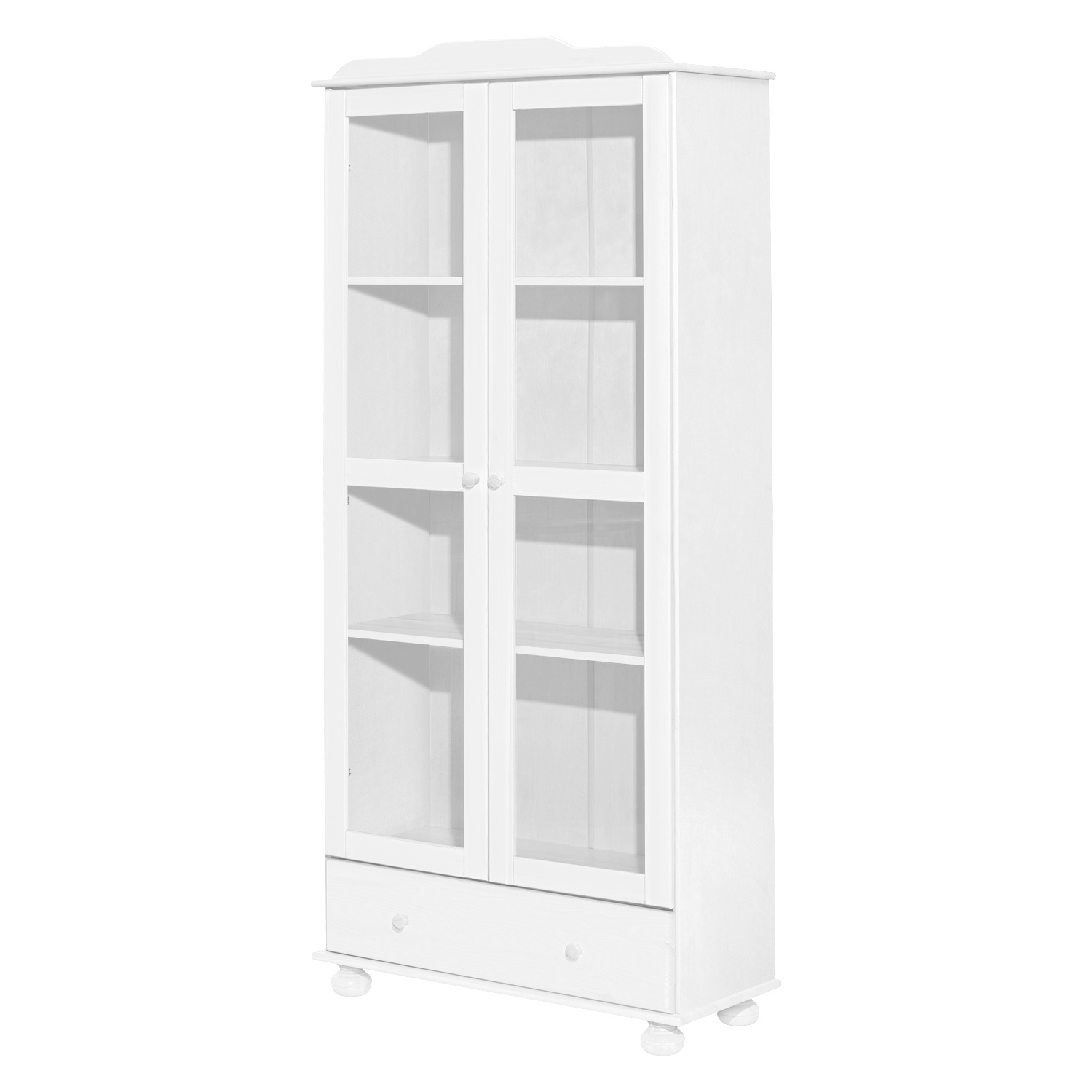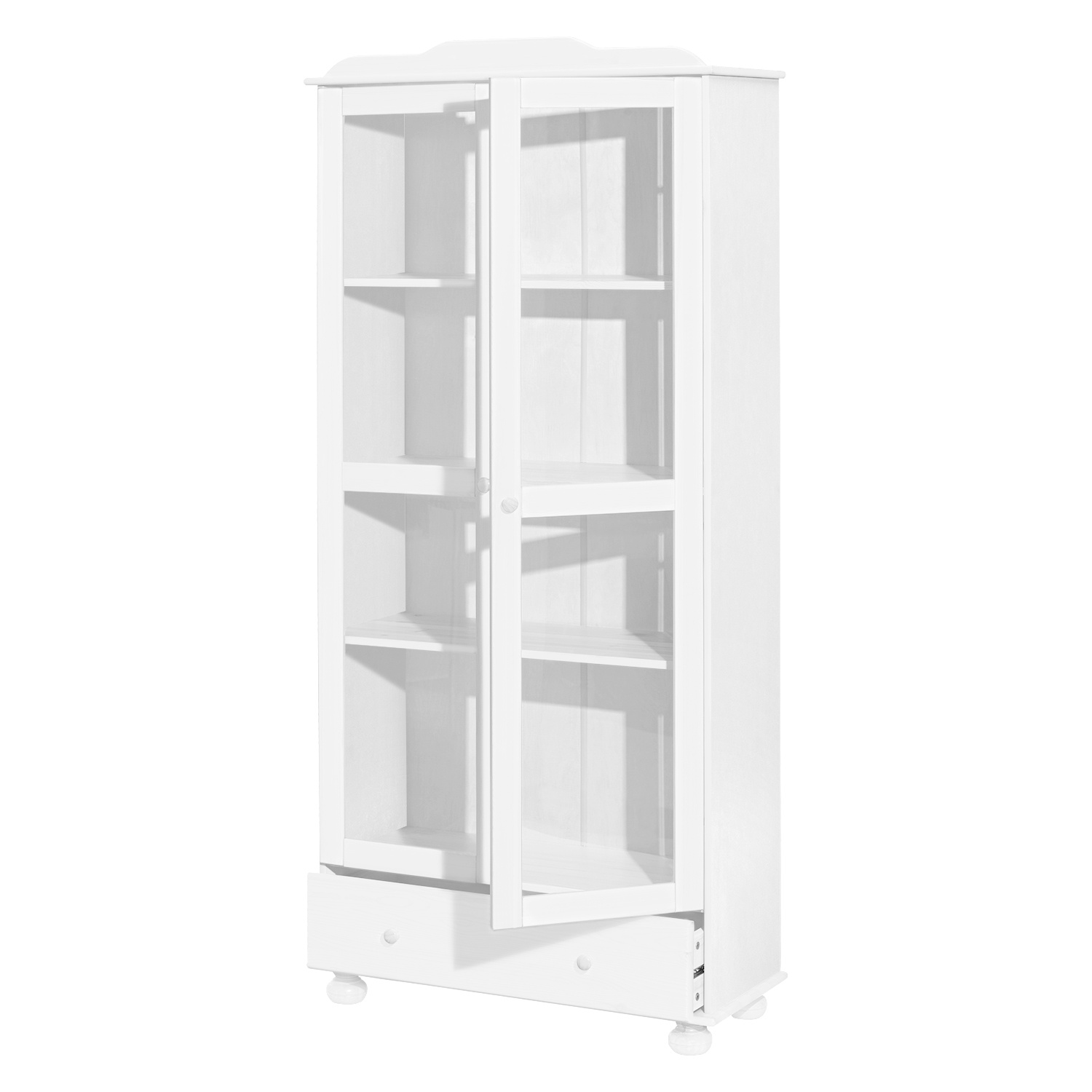 materiál masiv borovice, barevné provedení bílý lak široká zásuvka s kovovými pojezdy, 2 prosklené dveře, 2 variabilní a 1 pevná police
